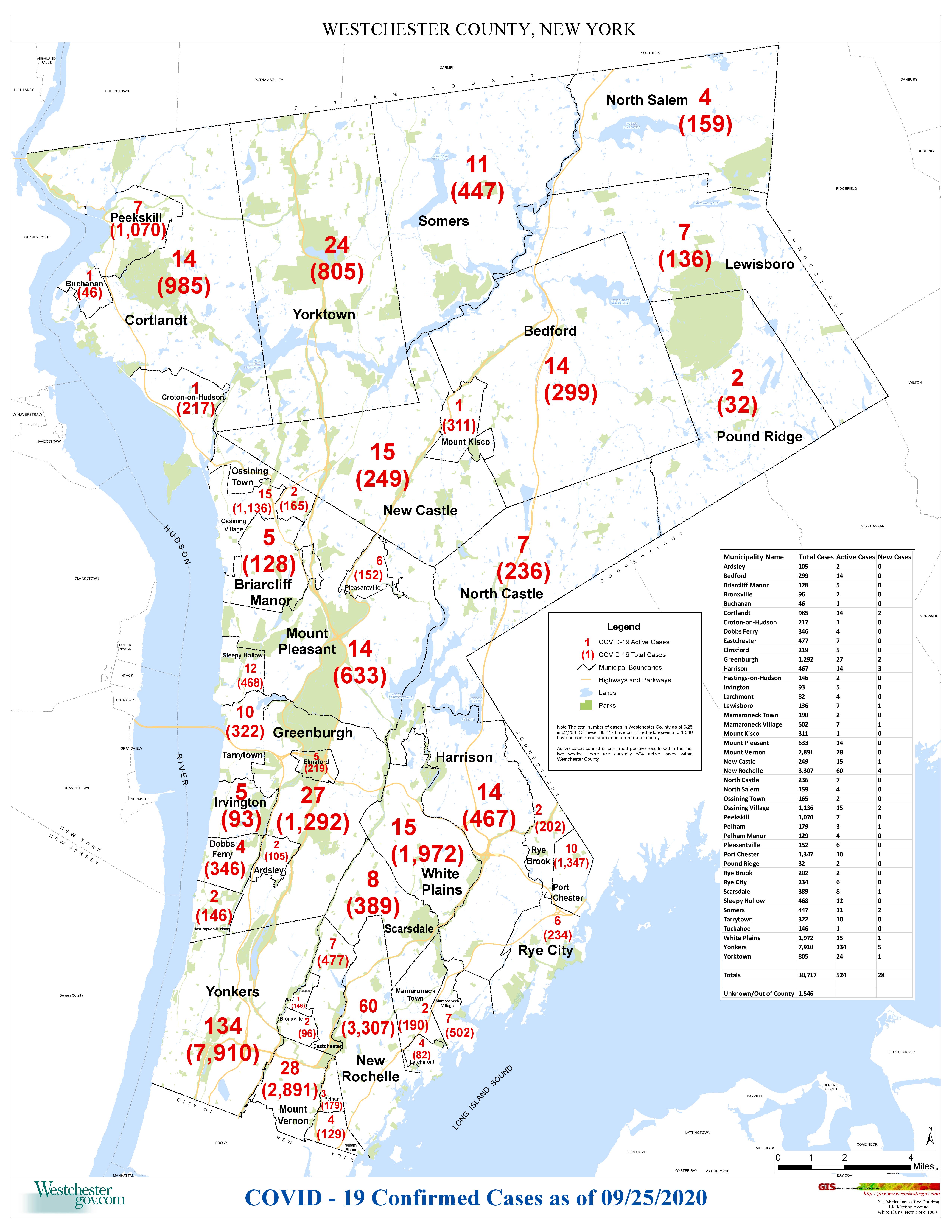 In the Town of Cortlandt since the beginning of the pandemic the Town has had 985 COVID-19 positive cases. As of today there are 14 active cases and the case load increased by 2 (Please refer to the map below). The information we are providing to our community comes directly from Westchester County government. This is how the numbers will be reported going forward. Once again, the number listed above is for unincorporated Cortlandt and does not include the Villages of Buchanan and Croton-on-Hudson. The unincorporated portion of the Town is everything outside of the Villages of Croton and Buchanan. That equates to 30 square miles and 32,000 people. Please abide by the Governor's guidelines to stay safe in order to prevent this virus from spreading. Thank you.