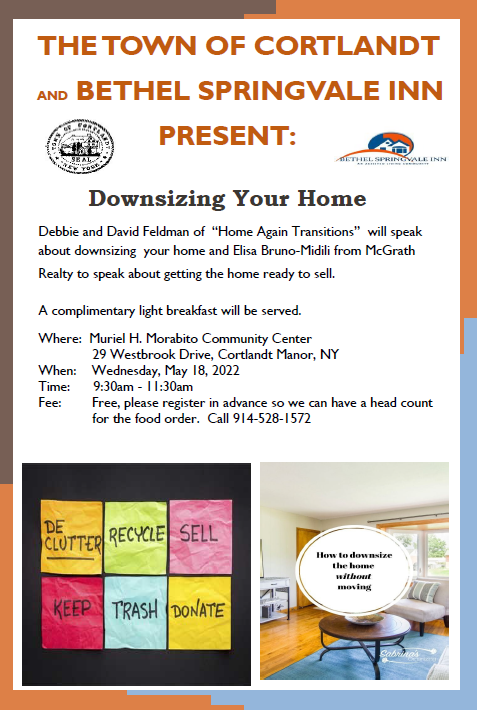 Join the Town of Cortlandt and Bethel Springvale Inn for a seminar about Downsizing your home. Debbie and David Feldman of “Home Again Transitions” will speak about downsizing your home and Elisa Bruno-Midili from McGrath Realty to speak about getting the home ready to sell.