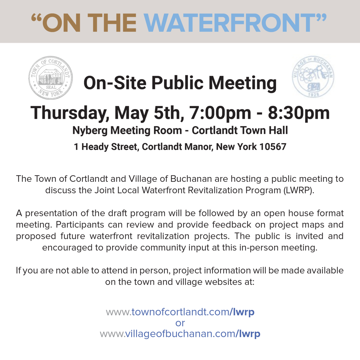 The Town of Cortlandt and Village of Buchanan are hosting a public information meeting in a rollout of the Joint Local Waterfront Revitalization Program (LWRP). The Hudson River waterfront and environs is the focus of the initiative.