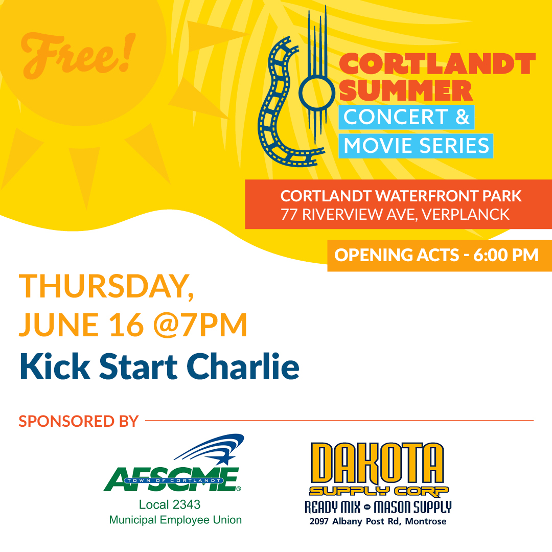 Get excited Cortlandt! Join us on Thursday, June 16th at 7:00 PM for the first kick-off concert of the series, featuring Kick Start Charlie, opening act begins at 6:00PM at the Cortlandt Waterfront Park located at 77 Riverview Avenue in Verplanck. This event is sponsored by Town of Cortlandt Employees AFSCME Local 2343 and Dakota Supply Corp./Bilotta Construction Corp.!
