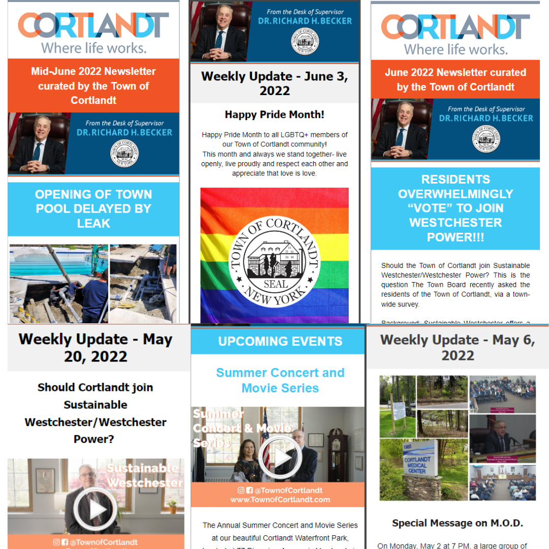 Did you know the Town sends out weekly e-newsletter on Fridays to help keep, you, our residents informed about everything Cortlandt? Learn about upcoming local events, must-have apps, employment opportunities, community achievements, messages from the Desk of Supervisor Dr. Richard Becker and more! You can subscribe by visiting https://lp.constantcontactpages.com/su/1UuJlzo. Share this with your family and friends!