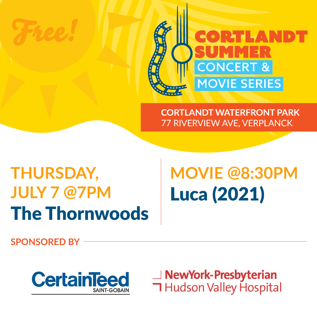 Mark your calendars! Join us on Thursday, July 7th at the Cortlandt Waterfront Park for a free concert and movie! The Thornwoods will start playing at 7:00pm and our first movie night will begin around 8:30pm featuring Luca (2021). This event is sponsored by Certainteed Gypsum and NewYork-Presbyterian Hudson Valley Hospital.
