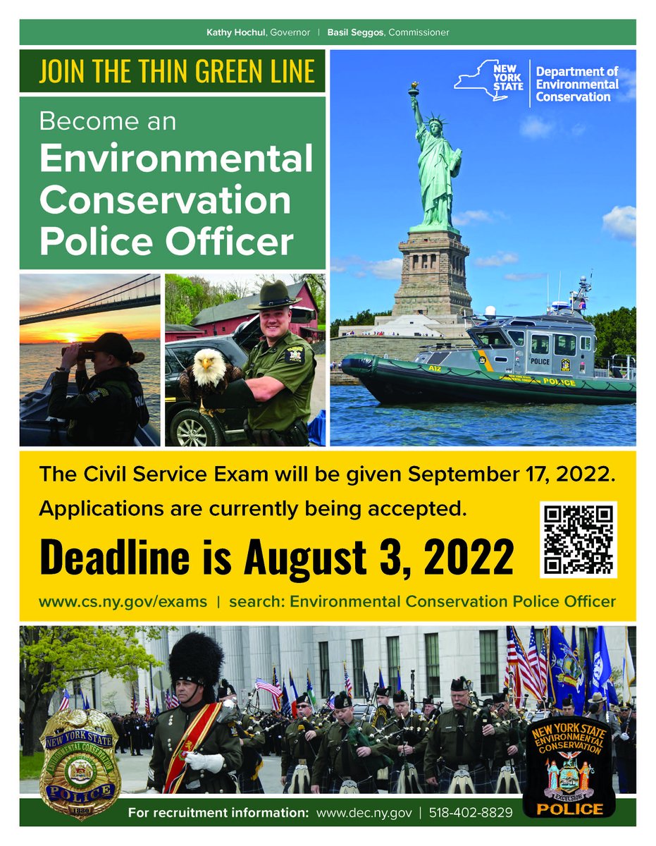 The New York State Department of Environmental Conservation is recruiting Environmental Conservation Police Officers (ECPO) for the first time in four years. Their civil service application deadline is August 3rd, 2022; the exam will be given on September 17th, 2022. DEC is pushing hard to recruit additional downstate candidates this year.
