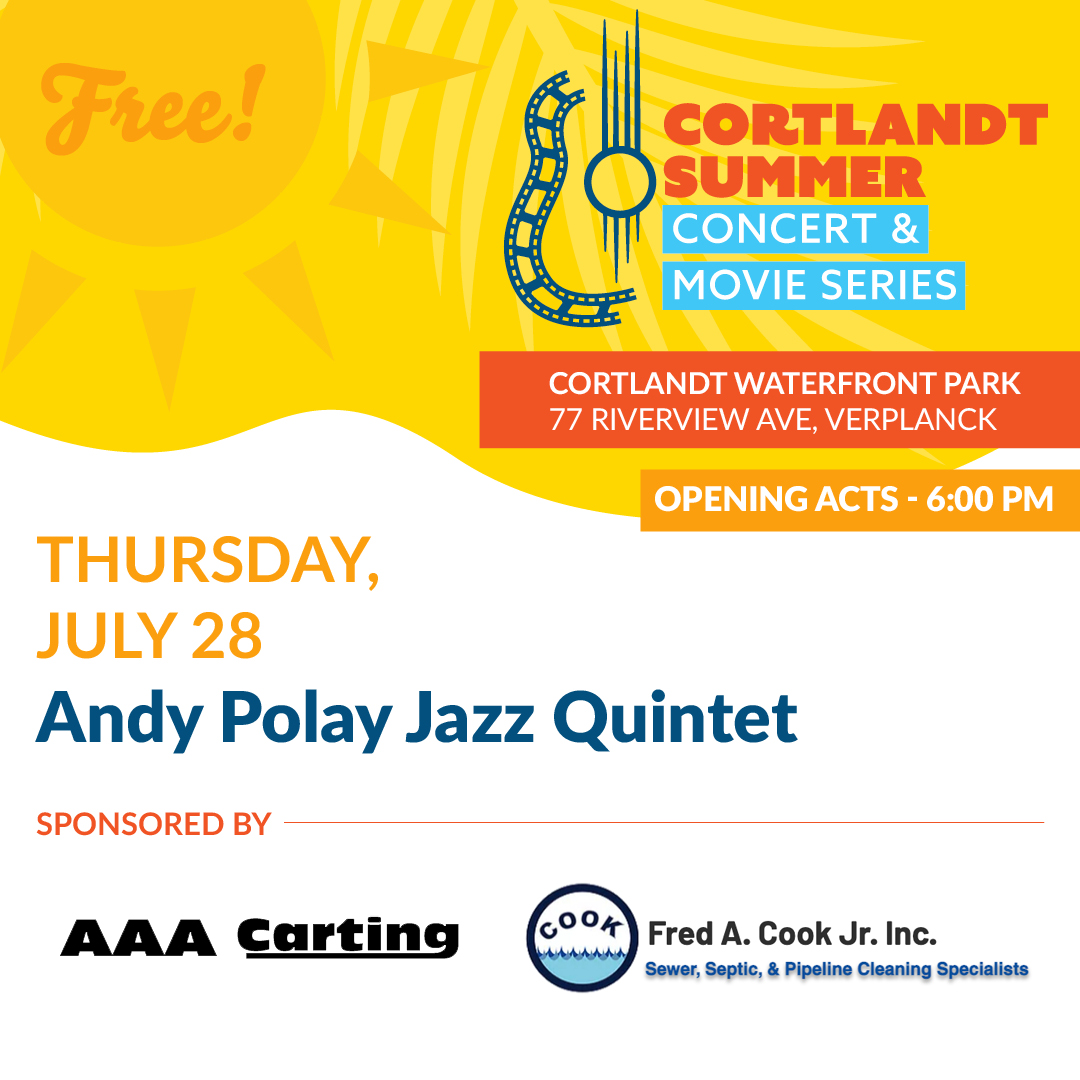 It’s showtime at the Cortlandt Waterfront Park! Join us on Thursday, July 28th at 7:00 PM for jazz music with Andy Polay Jazz Quintet. This concert event is sponsored by AAA Carting & Rubbish Removal, Inc. and Fred Cook Septic Tank Cleaning. Food vendors will be on site for dinner and snacks for purchase!