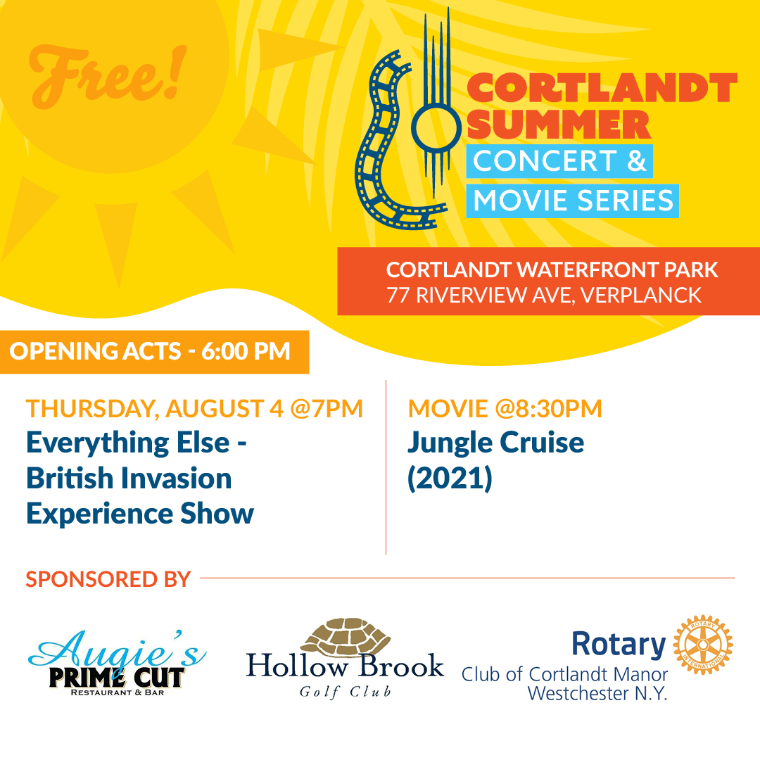 Don’t forget to join us for our last summer concert and movie of the season on Thursday, August 4th starting at 6PM with our opening act! Everything Else- British Invasion Experience Show will take the stage at 7:00PM followed by the movie, Jungle Cruise (2021), at 8:30PM. Make sure to bring your family and friends!