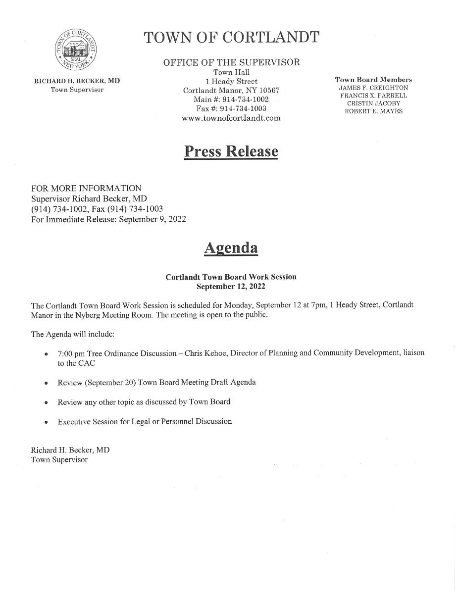 Agenda- Cortlandt Town Board Work Session- September 12, 2022