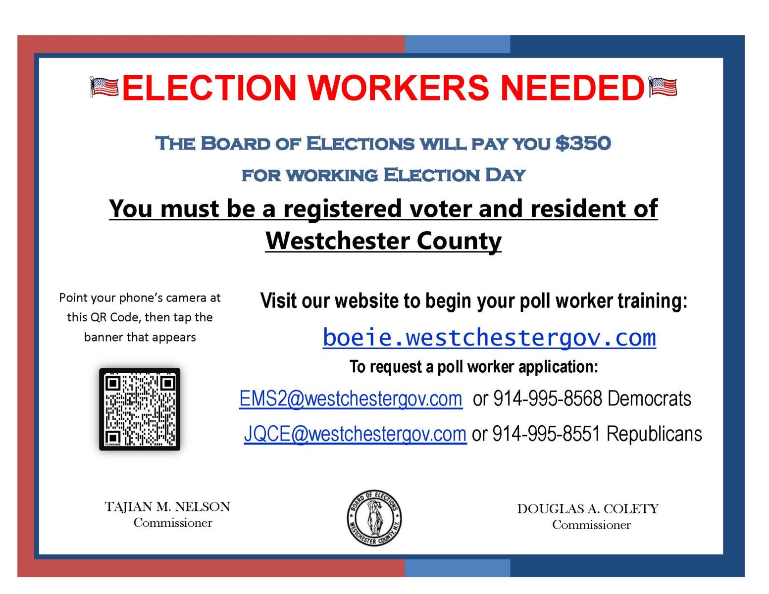 Westchester County is in need of election workers! To sign up, please visit http://boeie.westchestergov.com/.