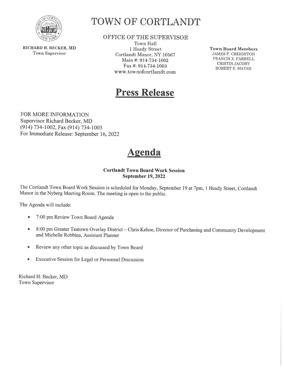 Agenda- Cortlandt Town Board Work Session- September 19, 2022