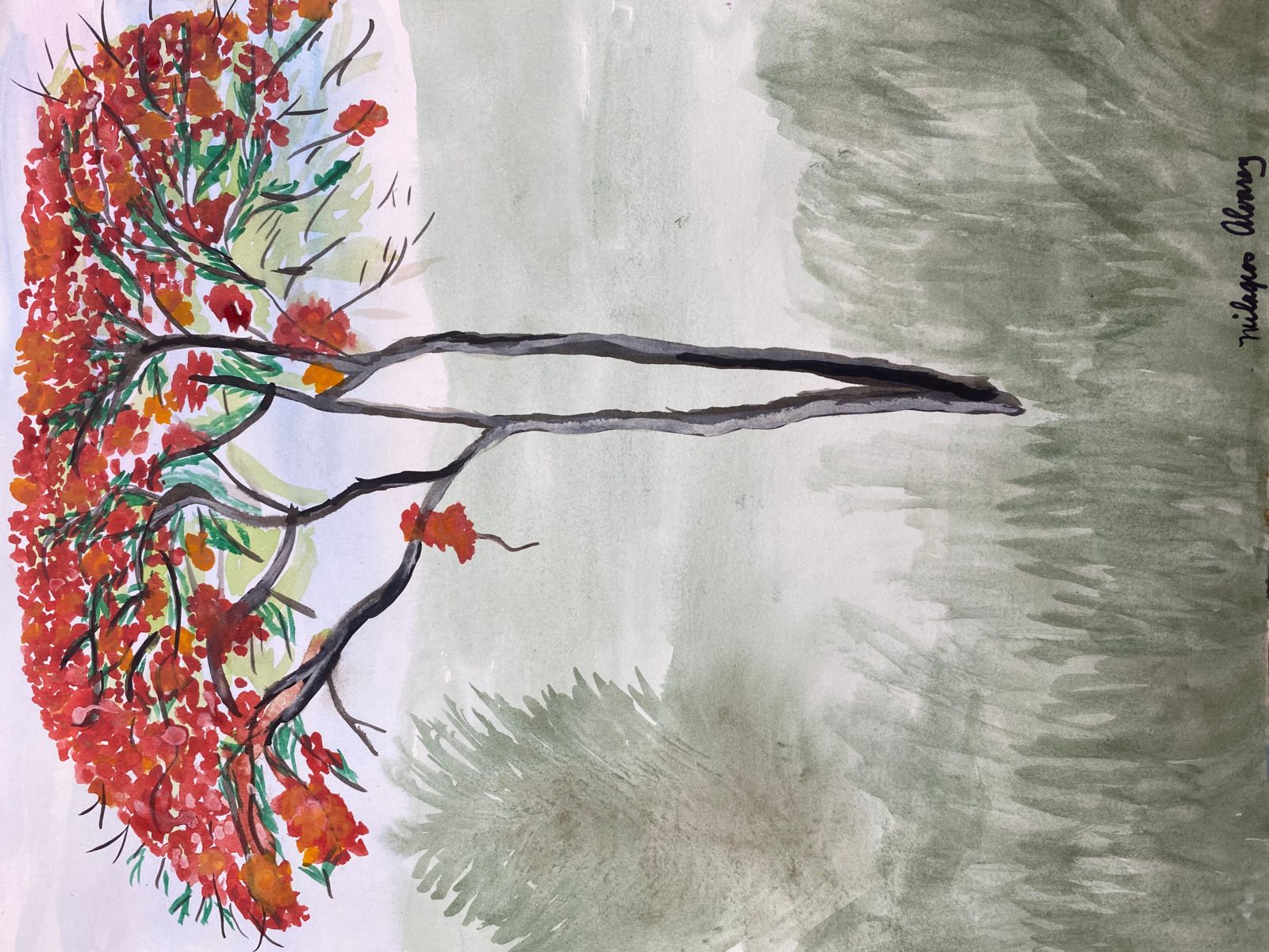 The Royal Poinciana also known as the Flamboyant Tree or Peacock Tree is a native of Madagascar. Brought to the Dominican Republic, Milagros Polanco Alvarez captures the Royal Poinciana’s fiery shades to remind her of her country.