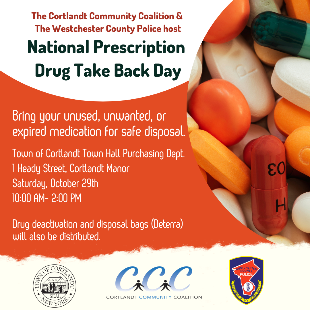 The National Prescription Drug Take Back Day on Saturday, October 29th, reflects the Cortlandt Community Coalition and the Westchester County Police Department's commitment to Americans’ safety and health, encouraging the public to remove unneeded medications from their homes as a measure of preventing medication misuse and opioid addiction from ever starting.