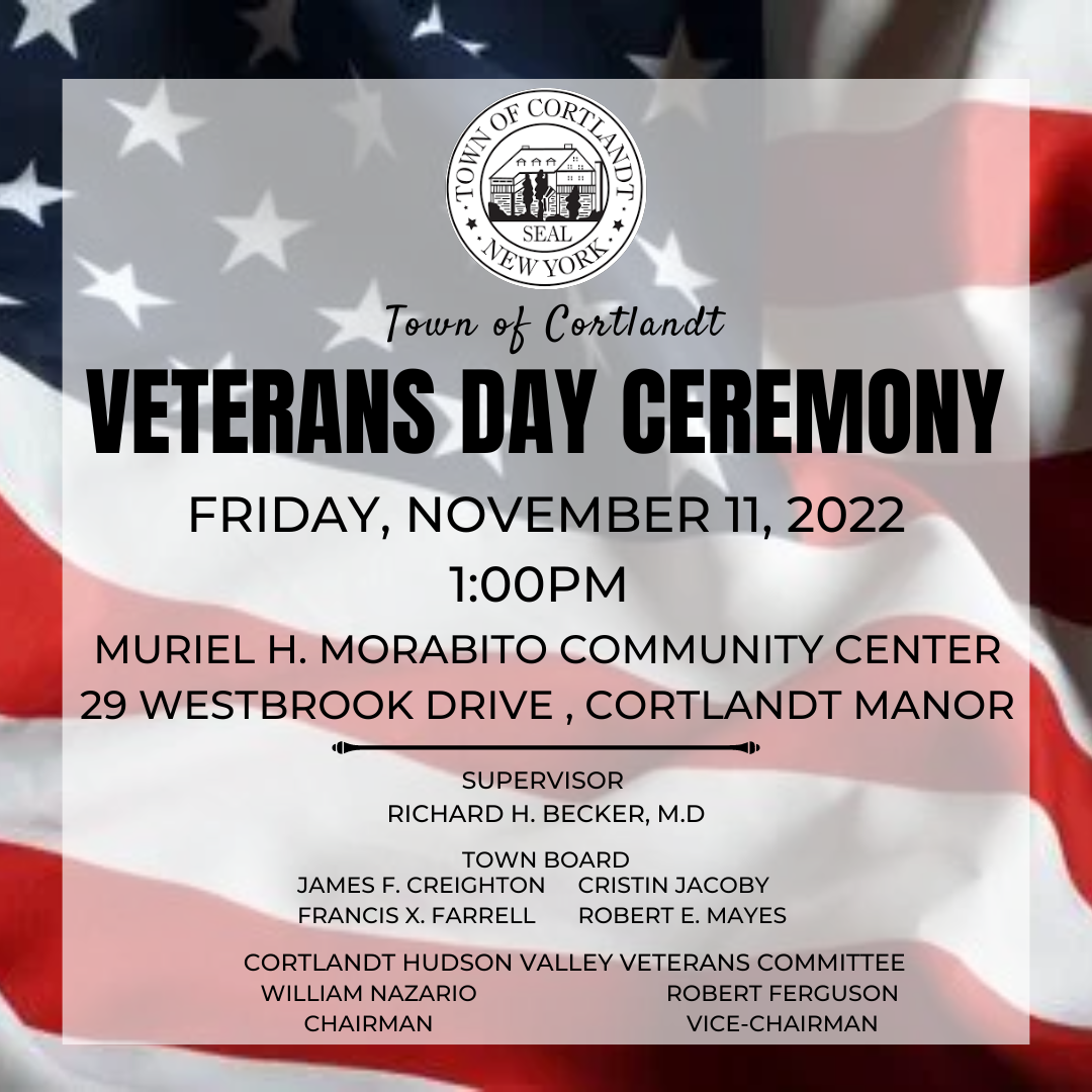 Please join us on this special day as we acknowledge and thank all our Veterans for their service to our Country especially those that paid the ultimate sacrifice! The Veterans Day Ceremony will be held on Friday, November 11 at 1:00PM at the Muriel H. Morabito Community Center. Refreshments will be served. Please RSVP to 914-528-1572 or to KarenG@townofcortlandt.com.