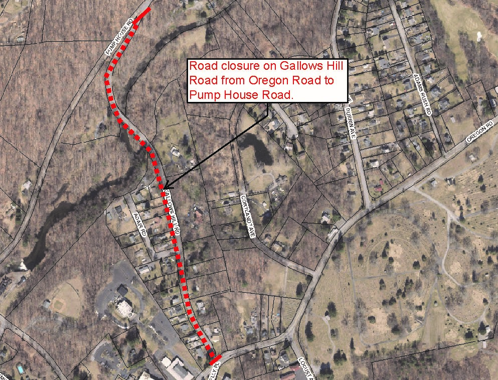 Gallows Hill Road will be closed from Oregon Road to Pumphouse Road in both directions to through traffic. The road closure is necessary to facilitate the repairs of a large water main supply line that has to be reconstructed along the bridge on Gallows Hill Road.