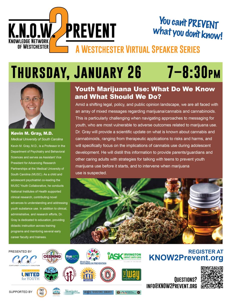 All parents and adult community members are invited to join the Cortlandt Community Coalition for a presentation by adolescent psychologist, youth substance use researcher and Professor at the Medical University of South Carolina, Dr. Kevin Gray.