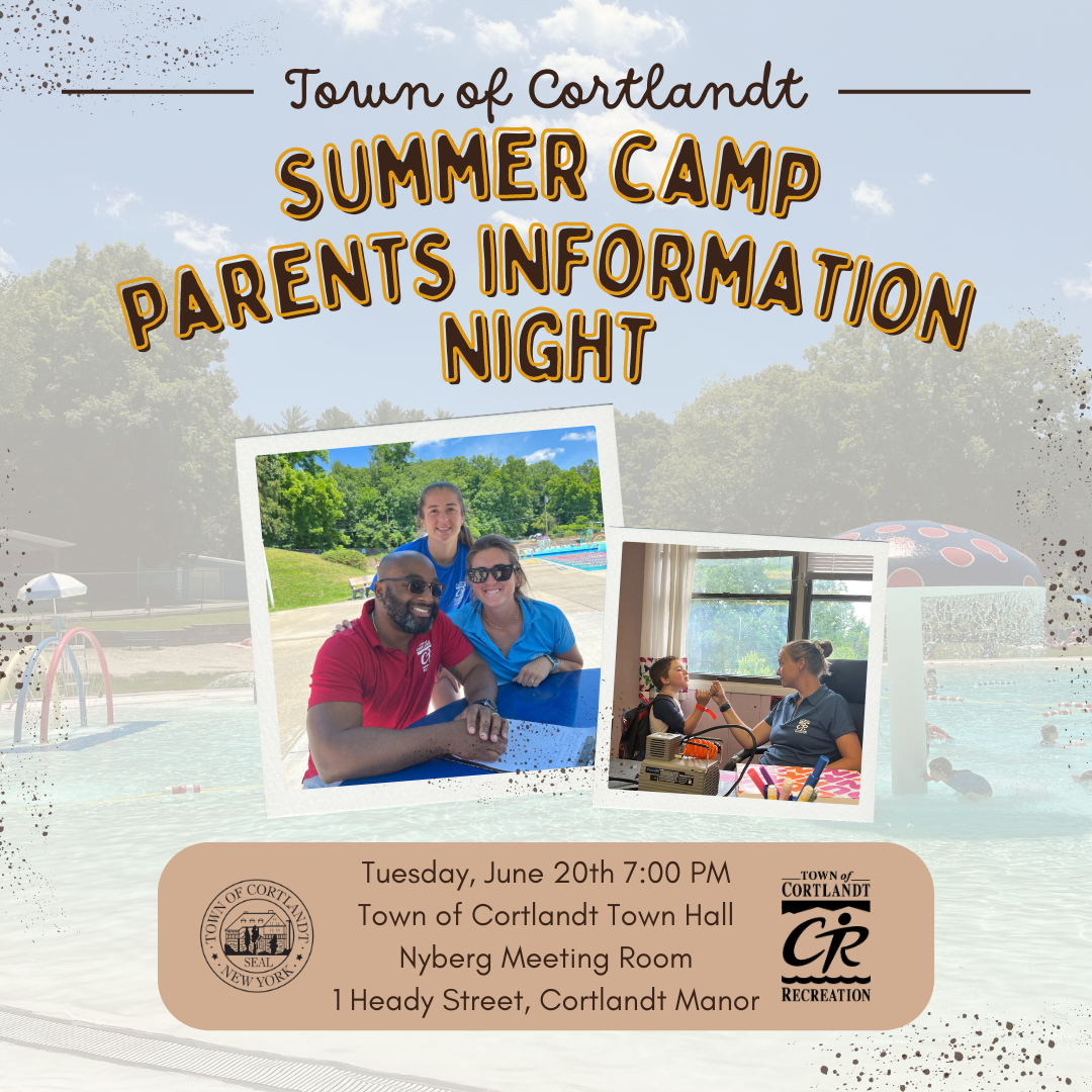 Mark your calendars! Join the Town of Cortlandt Recreation Department Camp Staff for the 2023 Parents Information Night on Tuesday, June 20th at 7:00 PM at Town of Cortlandt Town Hall in the Nyberg Meeting Room. Join us for the opportunity to meet your child's camp director, and various camp staff for the Day Camp, the 5th/6th Grade Camp, and the 7th/8th Grade Camp. You will be able to hear first hand about the camp program and ask any questions that you have!