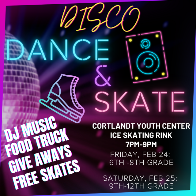 Come by the Cortlandt Youth Center at the Skate Rink for a night of skating, dancing and fun! Ice skating rentals and skating are FREE. Youth must be Town of Cortlandt residents to attend. American Dogs will be onsite for dinner and snacks for purchase! For more information, please call the Youth Center at 914-736-0498.
