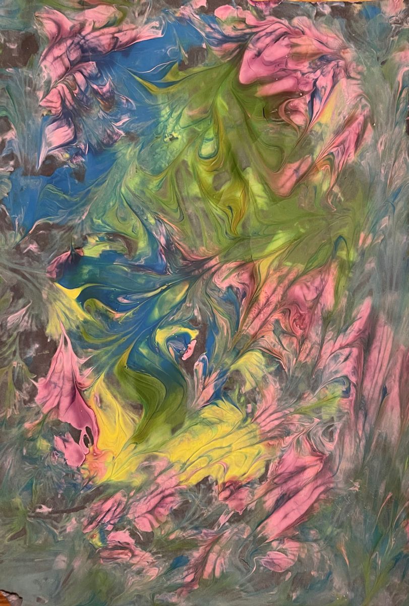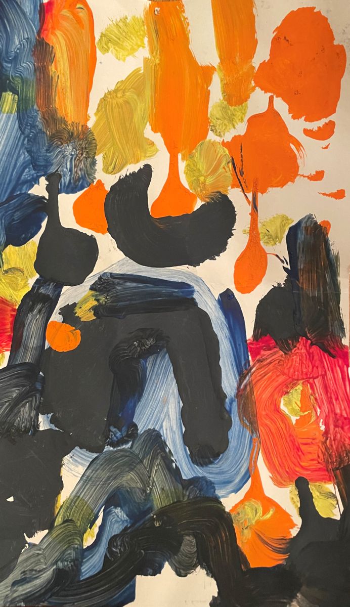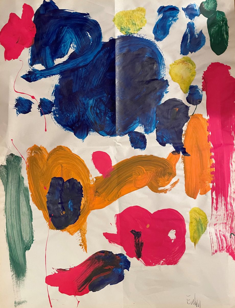 Today’s featured artist is Evelyn Pascarella. The bold expressive marks of Evelyn’s works caught my eye, along with her color combinations. As a kindergartner, Evelyn has not yet learned the formal language to describe her artistic decisions. Her expressions emerge from an intuitive place.