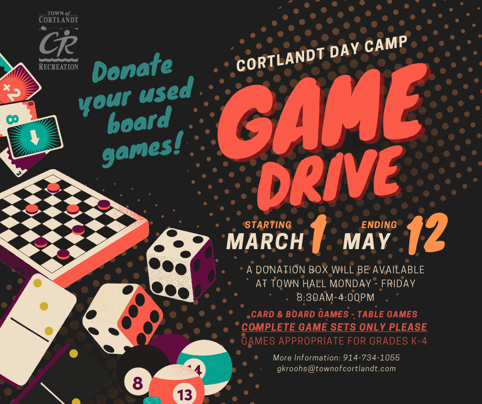 The Town of Cortlandt Recreation Department is accepting donations of lightly used or new (complete sets) games that would be approproiate for children in grades K-4th for our Summer Day Camp! A donation box will be available at Town of Cortlandt Town Hall, located at 1 Heady Street, Cortlandt Manor beginning March 1st- May 12th. Contact Recreation Supervisor, Greg Kroohs, at gkroohs@townofcortlandt.com or 914-734-1055 for any questions or concerns.