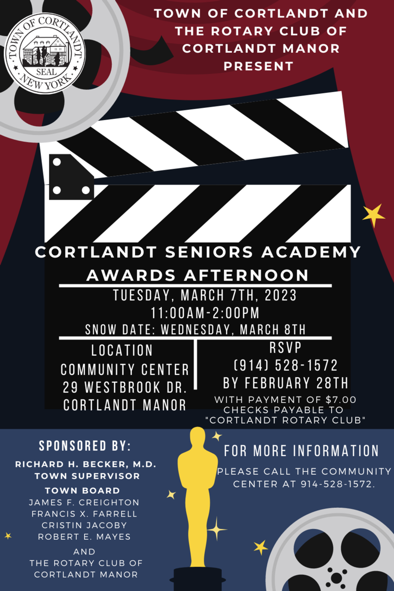 Walk the Red Carpet… Vote on your Fav’s… Be Voted Best Dressed… Enjoy A Catered Lunch… The Town of Cortlandt and the Rotary Club of Cortlandt Manor will be hosting the 9th Annual Cortlandt Seniors Academy Awards Afternoon at the Muriel H. Morabito Community Center located at 29 Westbrook Drive in Cortlandt Manor. Join us on March 7th (snow date Wednesday, March 8th) at 11:00am for an afternoon of glam, glitz and prizes. Gowns, suits, and glamor garb are encouraged. Sign up begins February 28th with payment of $7.00 in advance; make checks payable to Cortlandt Rotary Club. Please RSVP to 914-528-1572.