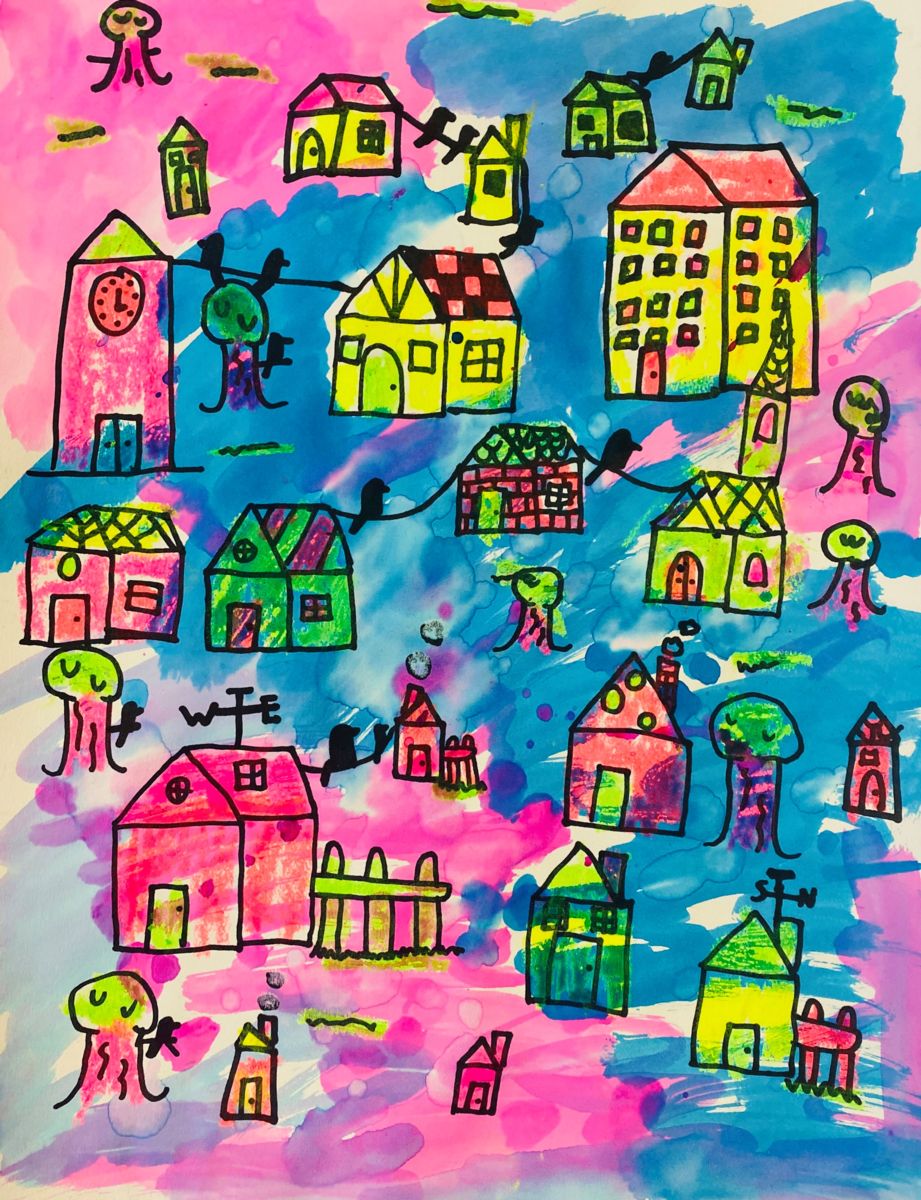 Jack’s work is a delight to take in. Our eyes are rewarded with exuberant color, bold lines, and considered details. Like a carefully planned garden, Village in Springtime, is simultaneously a scene and its discreet parts. It can be enjoyed as a whole, as individual parts, or as both. All rooting the viewer in a place of Jack’s devising.