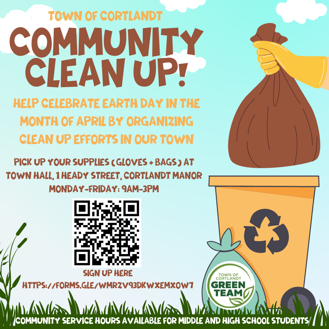 Throughout the month of April, the Town of Cortlandt Green Team is encouraging residents to participate in a community clean-up. All you have to do is gather friends and family and sign up! We’ll provide the gloves and bags. Pick up your supplies at Town Hall, 1 Heady Street, Cortlandt Manor, Monday-Friday between 9am-3pm. Are you a student? Participating in a clean-up can count as community service hours for middle and high school students! To sign up, please visit https://forms.gle/P3KrDmAAnCXESiku8