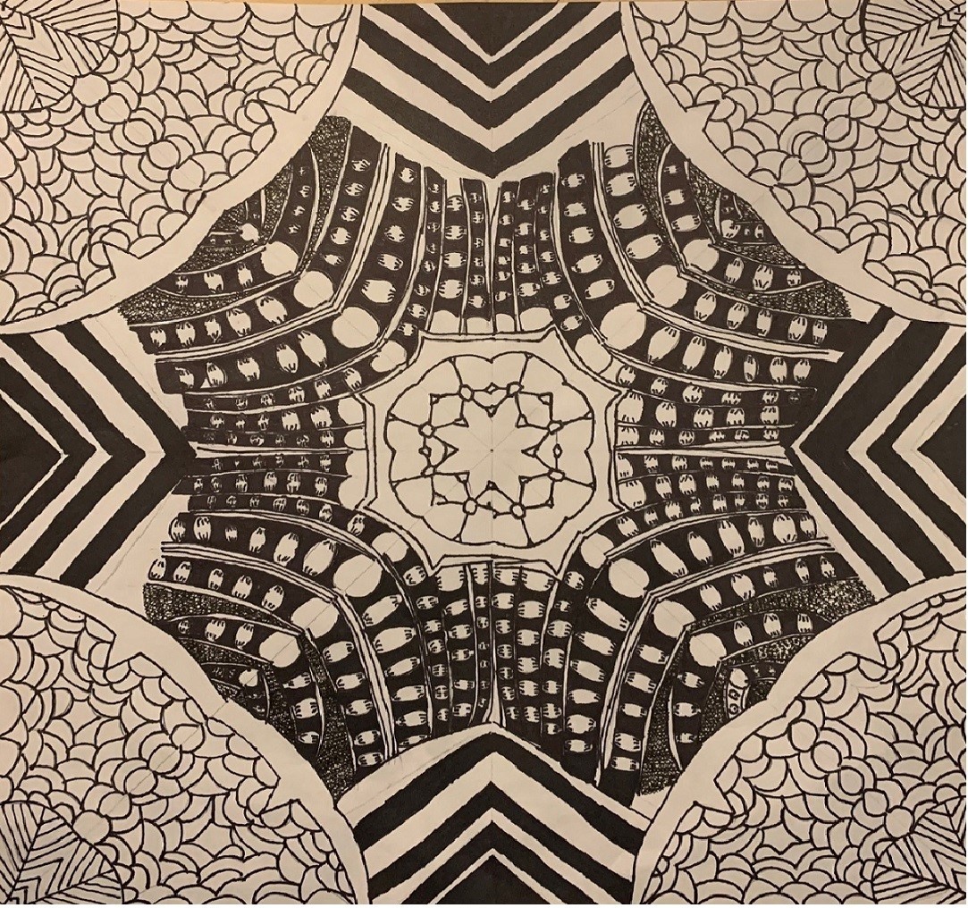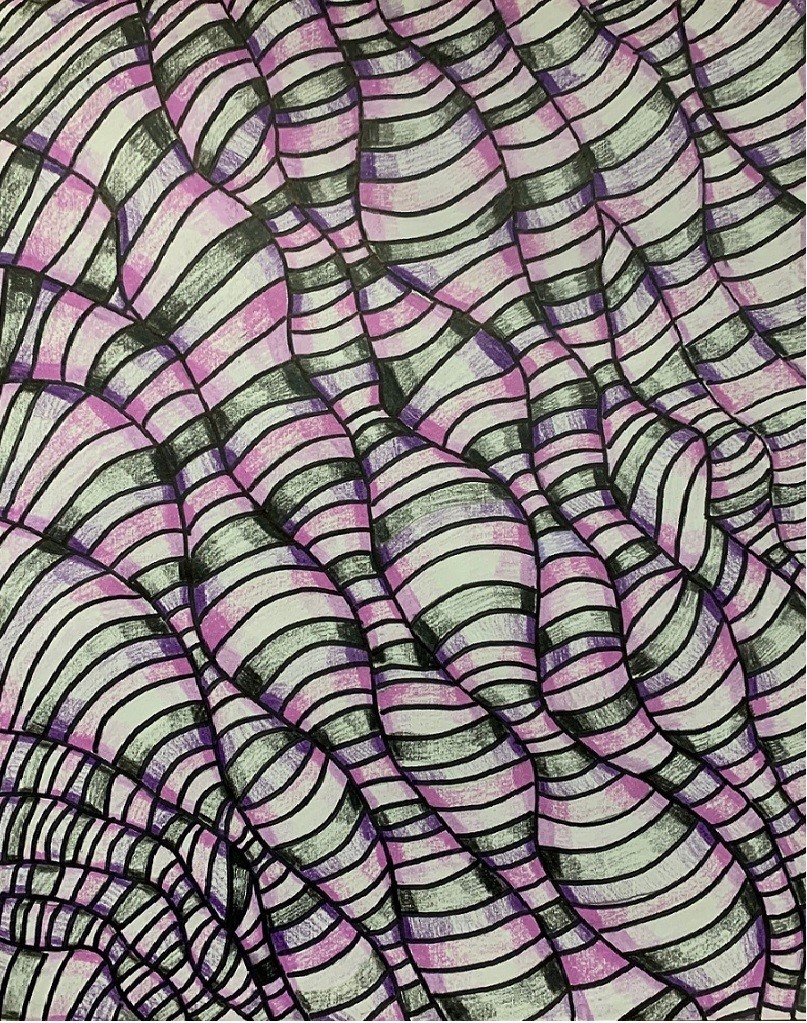 Victoria’s works are exercises in pattern and repetition. In nature we find pattern and repetition used by organisms large and small as building blocks. As in nature Victoria defines a shape or makes a mark, adding, subtracting, tweaking as needed, endlessly repeating, and stopped only by the edges of her paper. Achieving perfect patterns and repetitions often read visually as artificial or mechanical. Victoria’s work avoids this fate and closely aligns itself with the natural world with all the subtle variations in her marks.