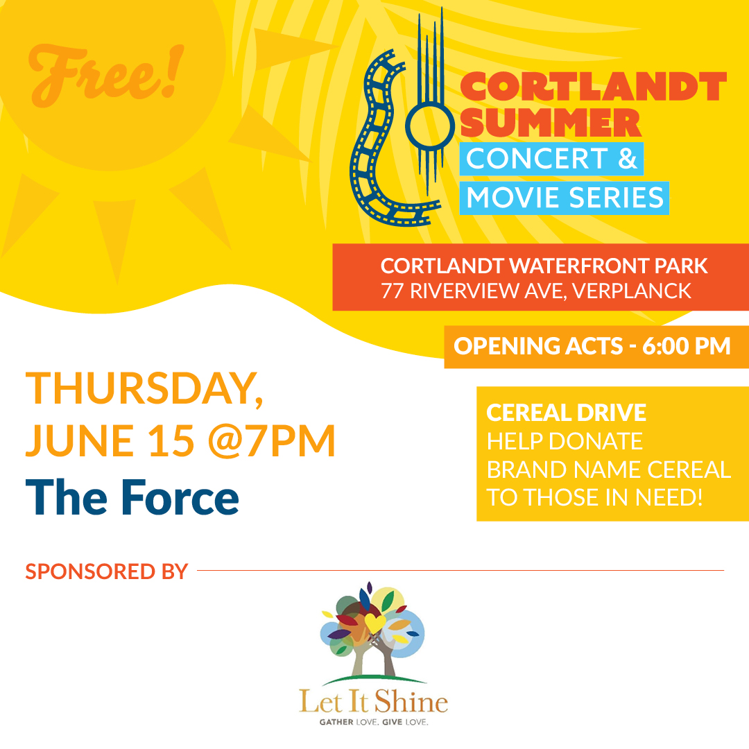 Ready to rock? The Town of Cortlandt is pleased to announce the start of the 2023 Summer Concert and Movie Series. Join us on Thursday, June 15 as we kick off the free, live outdoor concerts with The Force starting at 7:00PM at Cortlandt Waterfront Park (77 Riverview Ave, Verplanck). Also, the Town will have a cereal drive for our local neighborhood food pantry, Let It Shine in Verplanck! To contribute to this wonderful community organization, please bring a box of cereal!