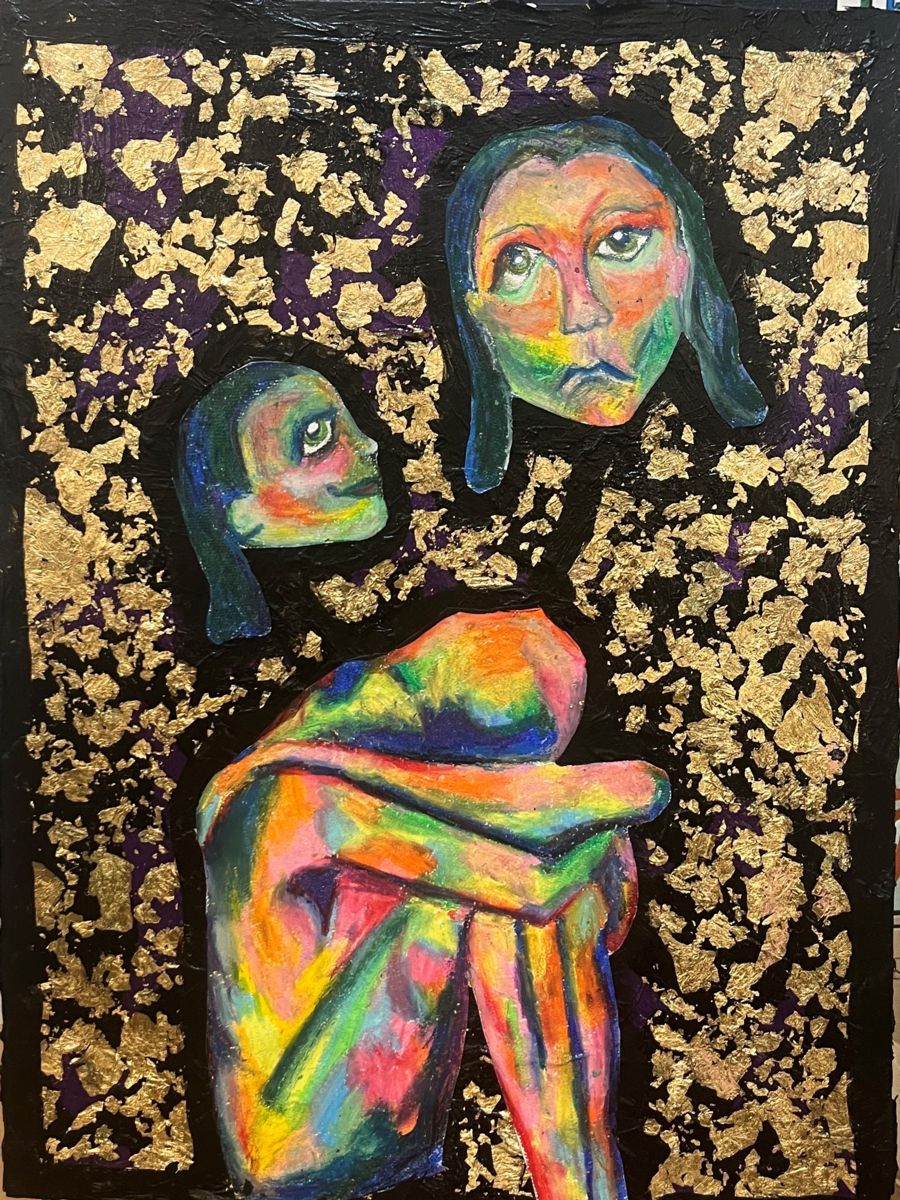 Oil pastel, acrylic paint, gold foil, and tissue paper on paper
