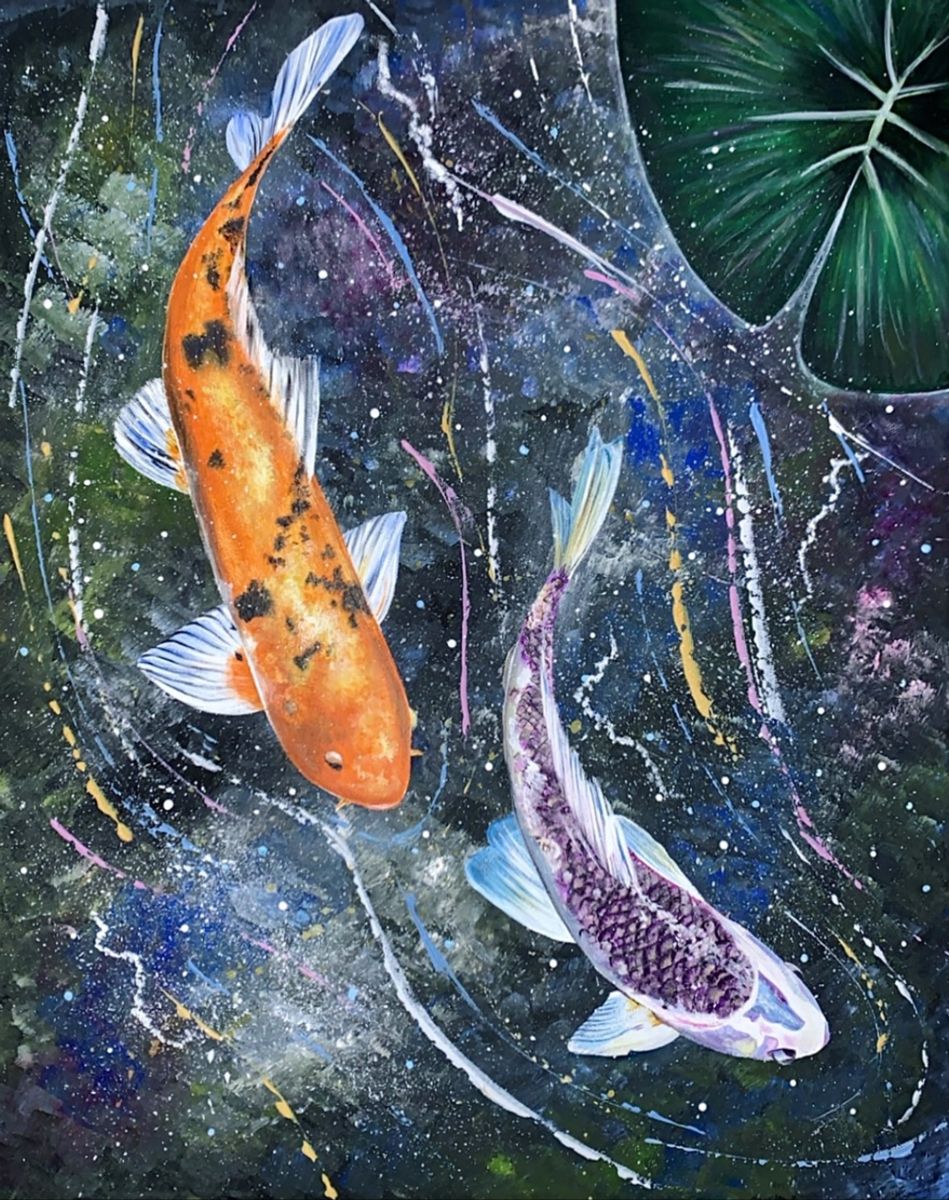 The first of this week’s featured artists from the exhibition, Towards Abstraction, on view at Town Hall through August 3rd is Ivy Yang. Ivy’s use of recognizable imagery and title, Koi, facilitates the viewer’s understanding of her work. Ivy subverts this understanding through her paint handling of the background. With spare marks possibly describing ripples around the Koi, the substance though which they swim is uncertain. The viewer can interpret it as water, but also as a field in space. This uncertainty allows the viewer an expansive interpretation of the image rather than a literal interpretation.