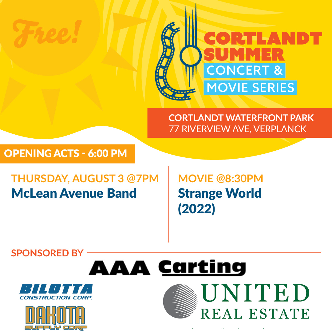 Don't forget to join us for the last concert and movie night on Thursday, August 3rd starting at 6:00pm with our opening act, Ava Schembari. The main performance, McLean Avenue Band, are bringing their wonderful arrangements of pop, rock and folk songs, intertwined with Traditional Irish tunes and upbeat melodies. The movie, Strange World (2022), will start playing at 8:30PM. This event is sponsored by AAA Carting & Rubbish Removal, Inc., Bilotta Construction Corp. and United Real Estate. Food vendors will be on site for dinner and snacks for purchase!