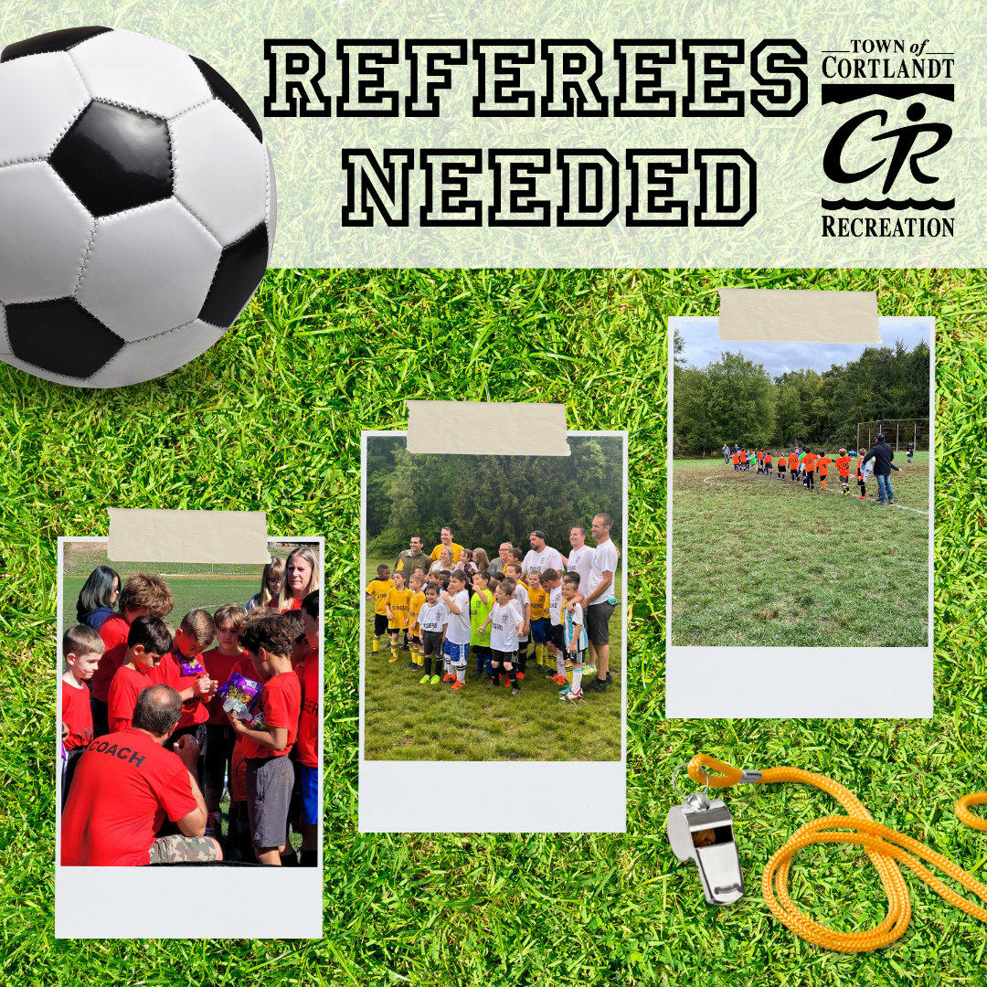 The Town of Cortlandt Recreation Department is in need of referees for the fall season of Soccer League. No experience necessary, but experience is preferred. Games are on Sundays, individuals must be available from 9 AM- 1 PM. For more information or questions, please contact Recreation Supervisor, Greg Kroohs, at gkoohs@townofcortlandt.com or 914-734-1055.