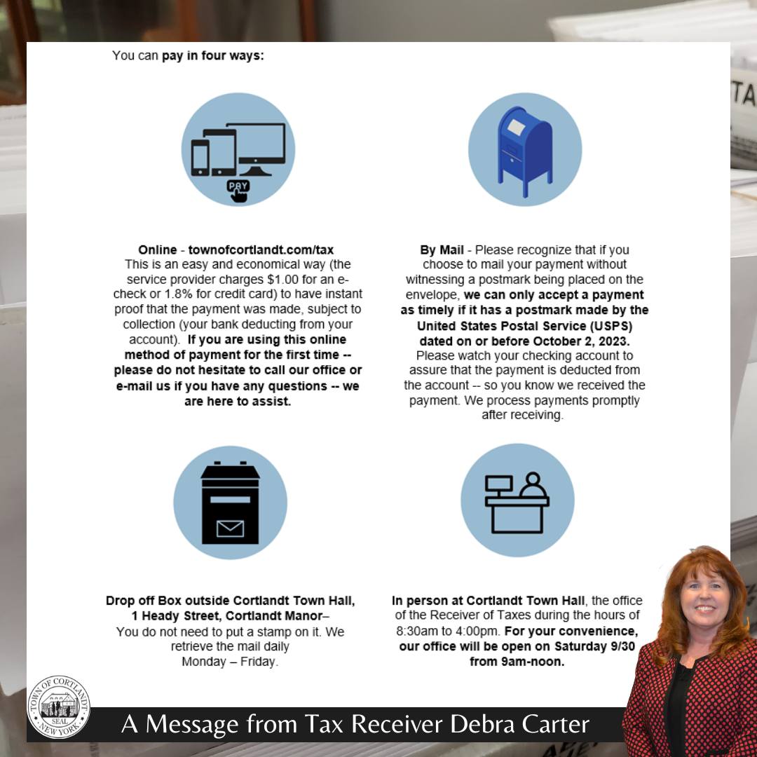 Just a reminder- The first installment of your 2023/2024 school tax is due by 9/30/2023. Please note that September 30, 2023 is a Saturday. For your convenience, our office will be open on Saturday 9/30 from 9am-noon. In addition, since the due date falls on a weekend, you can also pay in person, online, or mailed with a postmark on or before Monday October 2nd without penalty.