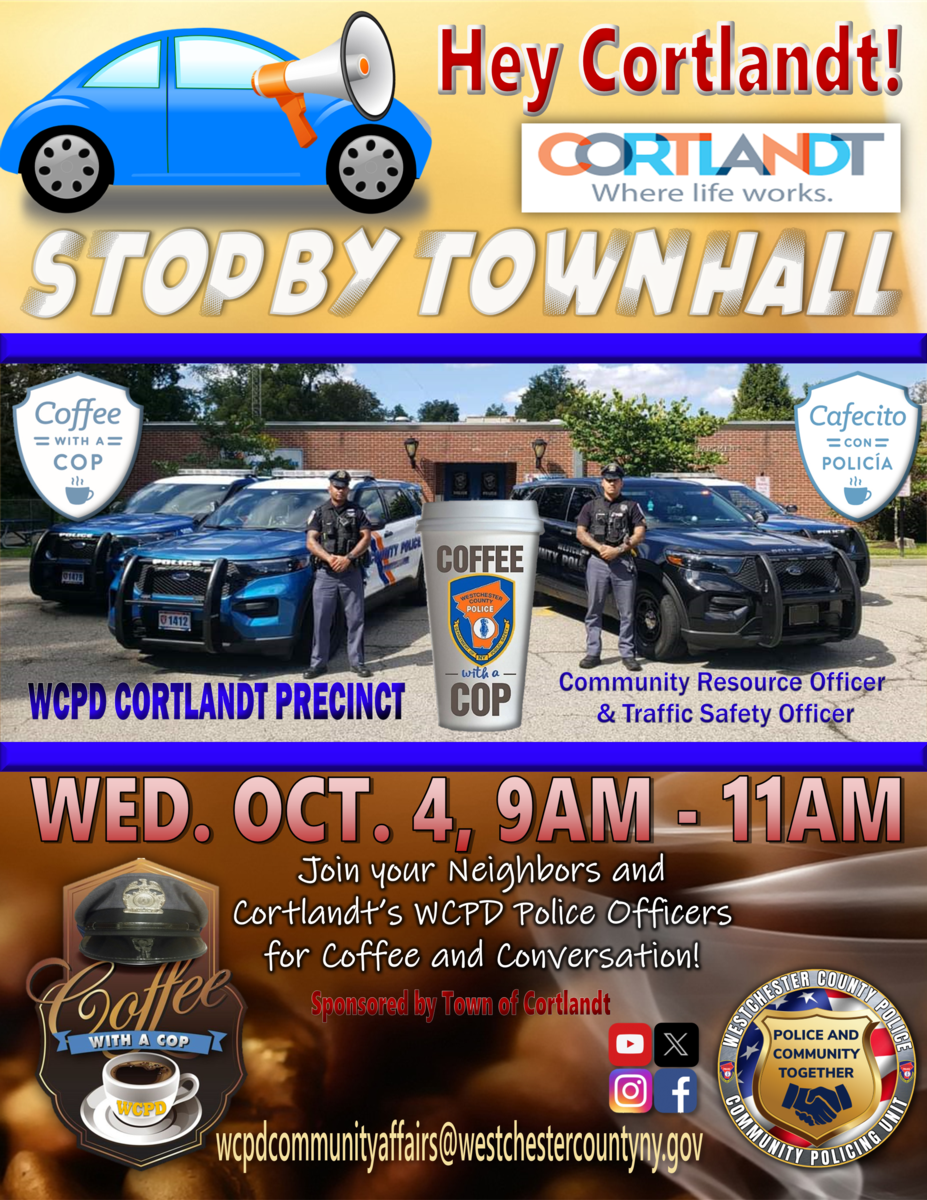 October 4th is National Coffee with a Cop Day! Join our Westchester County Community Resource Officer Deopaul Mahadeo and Traffic Safety Officer Al Ramos for coffee and conversation! Stop by Cortlandt Town Hall between 9:00am-11:00am. See you there!