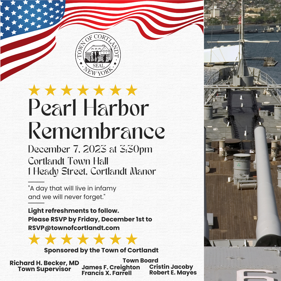 Please join the Town of Cortlandt and the surrounding villages for the Pearl Harbor Remembrance Day Ceremony at Cortlandt Town Hall on Thursday, December 7th at 3:30PM. Light refreshments to follow. Please RSVP by Friday, December 1st to RSVP@townofcortlandt.com.