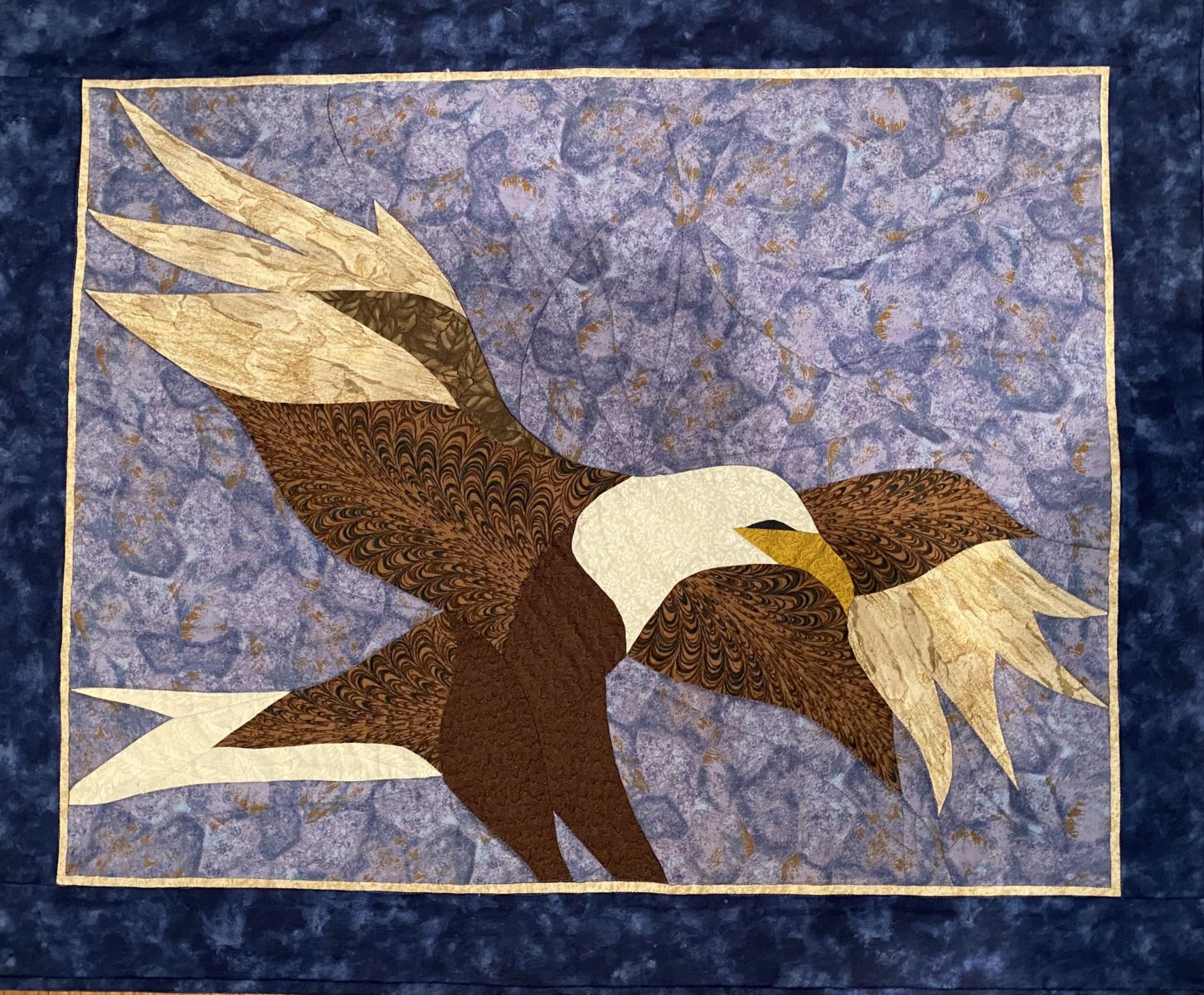 The newly opened exhibition, Cortlandt Fiber Arts: A Contemporary Survey, explores contemporary trends in fiber-based works. In honor of Veteran’s Day we are highlighting Grace Kelly Zipprich’s quilt, Eagle in Flight. Moving beyond the traditional use of pattern in quilting, Grace constructs a dramatic image of our national bird in flight. With considered selections Grace reproduces the bald eagle’s striking plumage in fabric and with radiating stitching in the bluish lavender ground reinforces the eagle as the focal point of the composition.