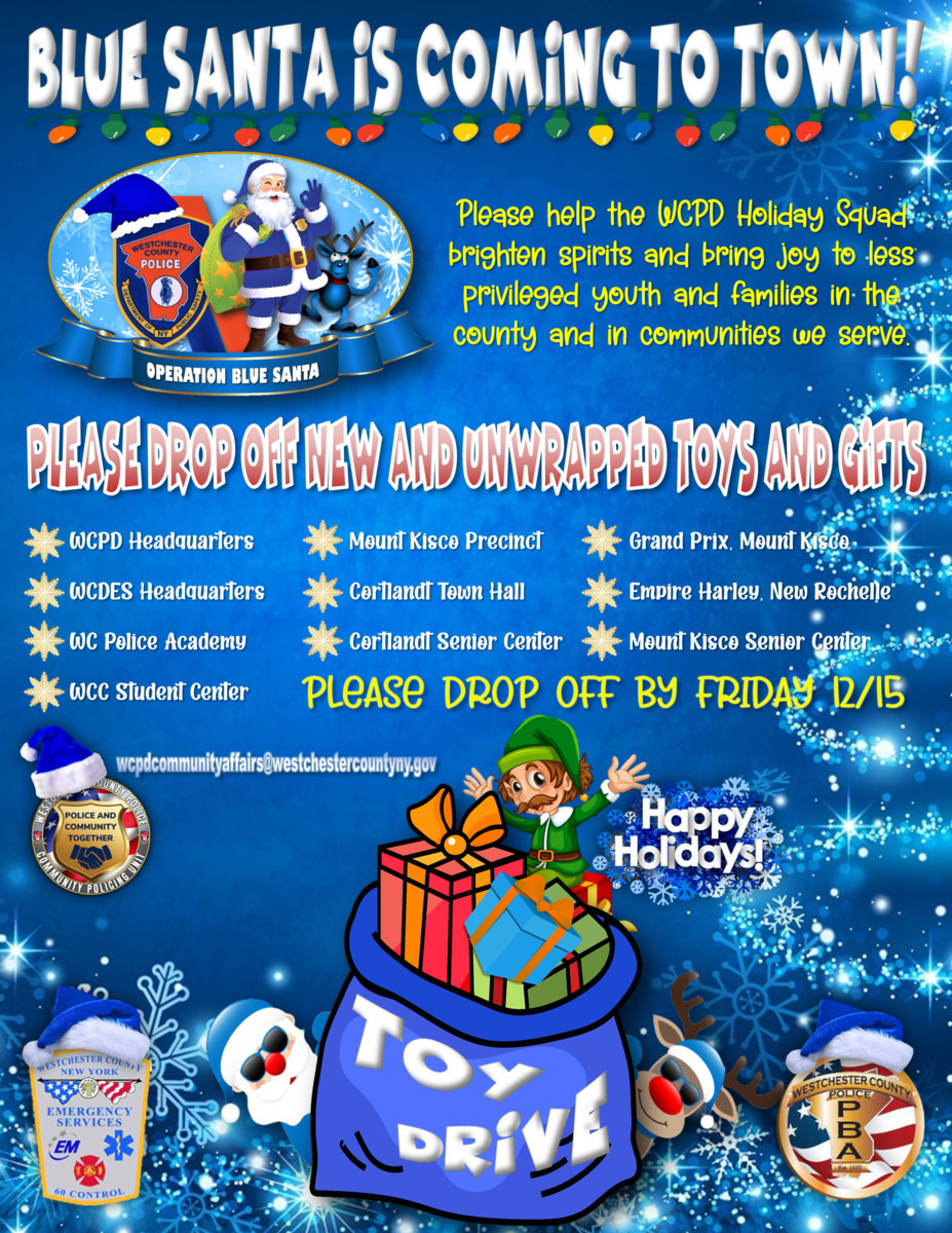 ‘Tis the season for a Toy Drive! Please help the Westchester County Police Department Holiday Squad brighten spirits and bring joy to less privileged youth and families in the county and in communities they serve. We are calling upon our generous community to help us collect new, unwrapped toys for those in need. Your support will make a difference! Let's come together as a community and bring smiles to the faces of those who need it the most.