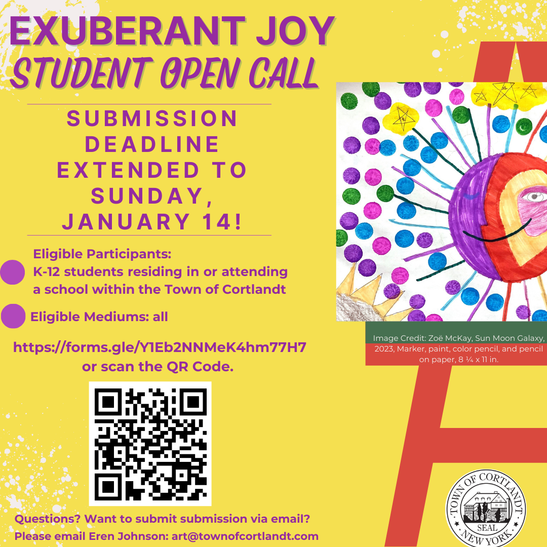 The submission deadline for the Exuberant Joy Student Exhibition open call has been extended to Sunday, January 14 at 11:59pm. All K-12 students residing in or attending a school within the Town of Cortlandt can submit up to 3 works at https://forms.gle/Y1Eb2NNMeK4hm77H7. A celebration of joy in all its forms this exhibition seeks works from student artists that embody the themes of joy, delight, glee, excitement, cheerfulness, lightheartedness or bold expressions. Eligible mediums are paintings, works on paper, photography, textiles and more! Questions? Want to submit submission via email? Please email Eren Johnson at art@townofcortlandt.com.