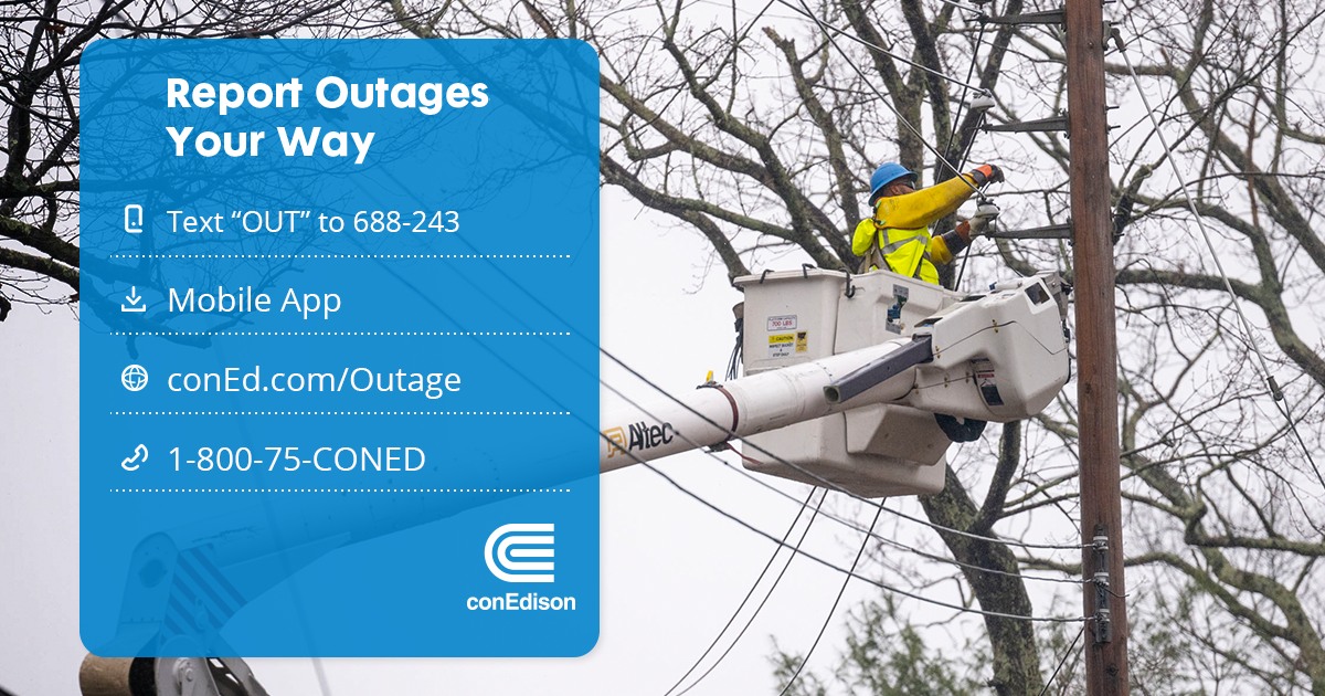 Information on outages and restoration times is available on the Con Edison OUTAGE MAP
