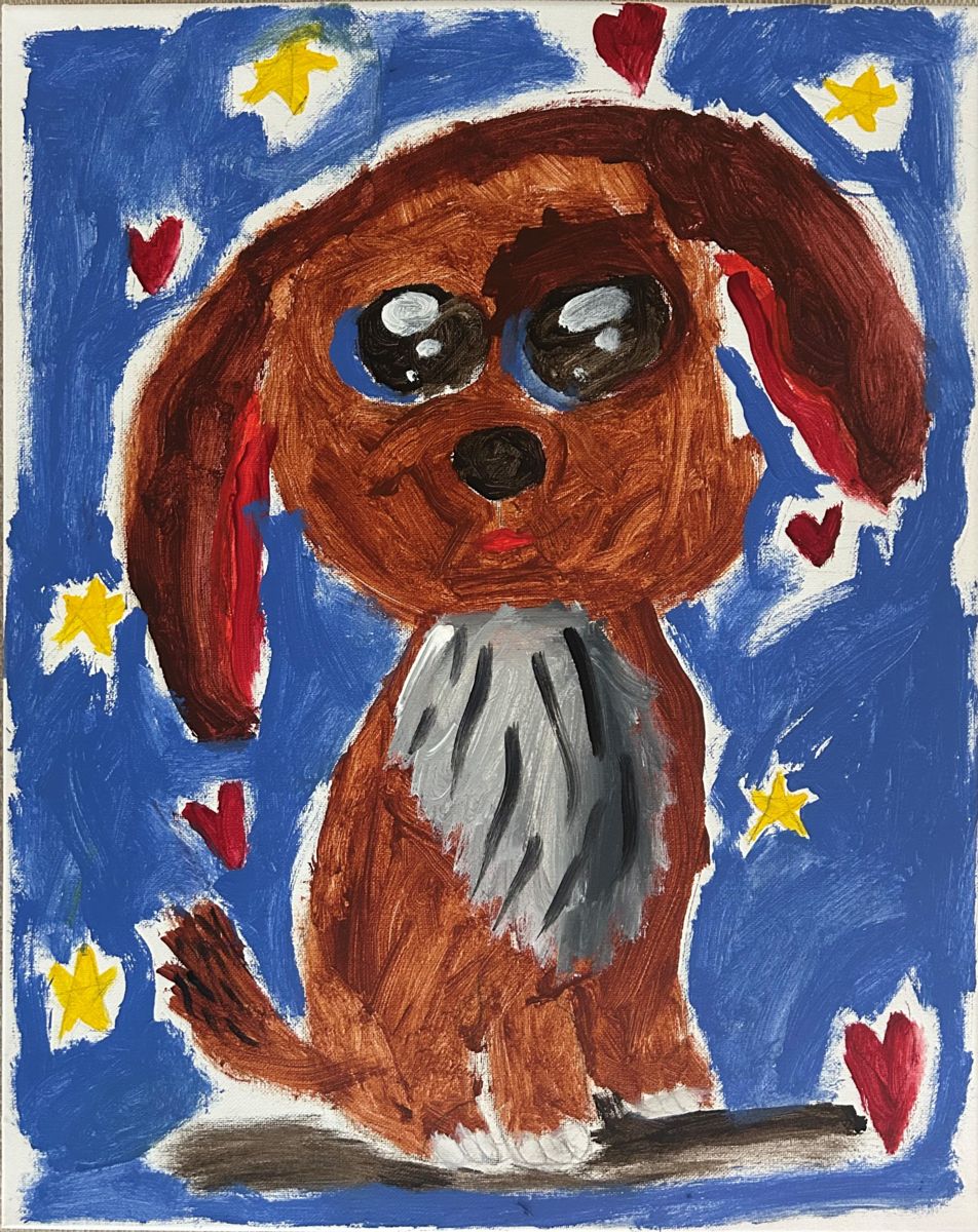 “My name is Imogen and I am in First Grade. I like making all kinds of art. I made these paintings because I think puppies bring joy.”