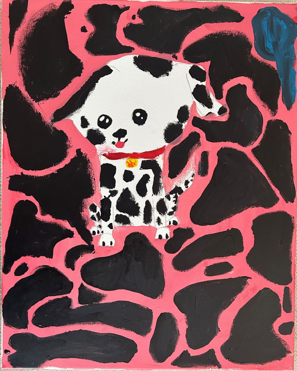 Recently opened, the 2nd Annual Student Exhibition at Town Hall Exuberant Joy celebrates joy in all its forms. The creative expressions of children often depict the real or imagined things, people, or places that bring them joy. For Imogen Sewell, it is puppies. Centered as icons in her compositions, Imogen’s puppies are pure joy. Lovingly rendered, Imogen carefully illustrates the spot pattern in Dalmatian, Arfie’s shaggy coat and the twinkle in both their eyes.