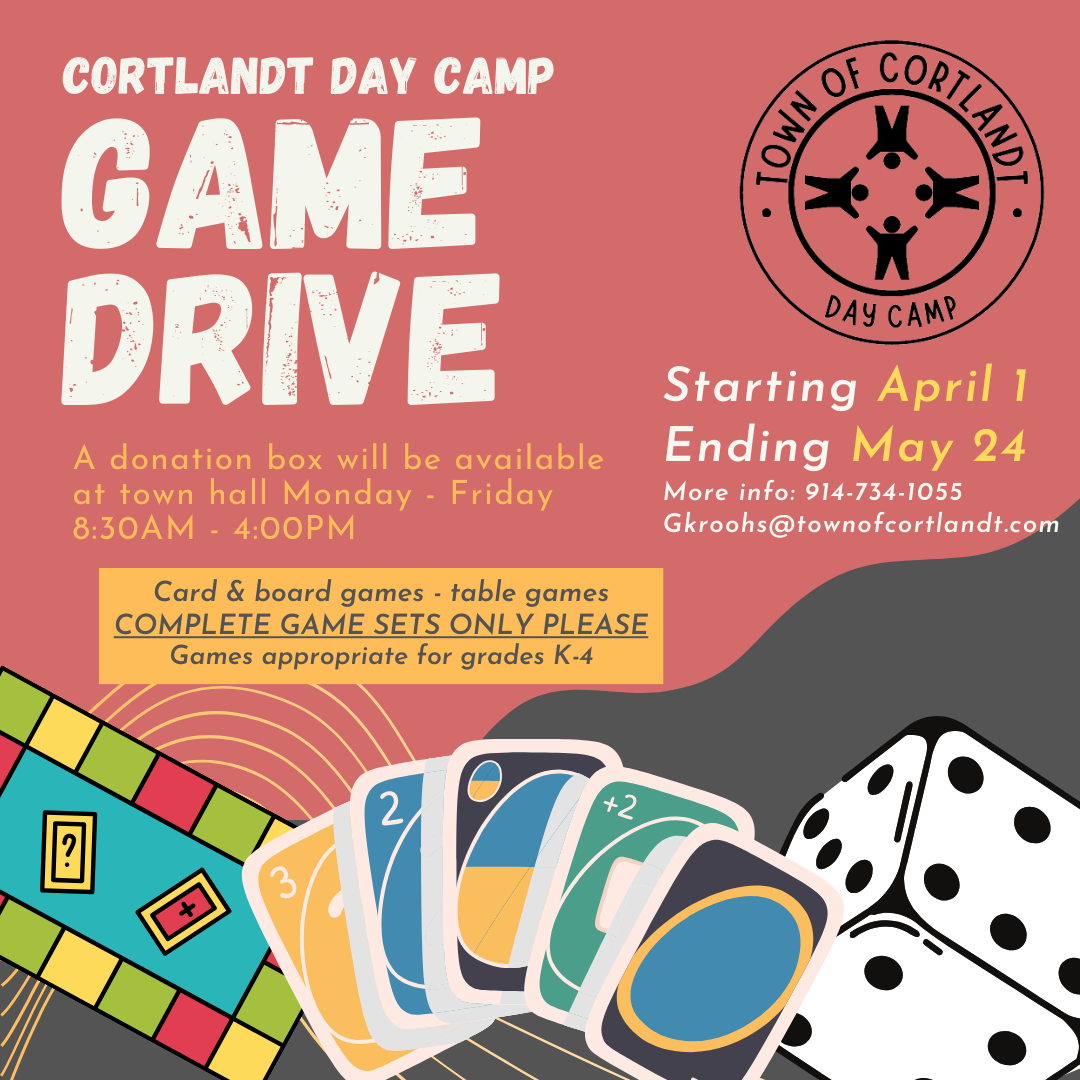 The Town of Cortlandt Recreation Department is accepting donations of lightly used or new (complete sets) games that would be appropriate for children in grades K-4th for our Summer Day Camp!