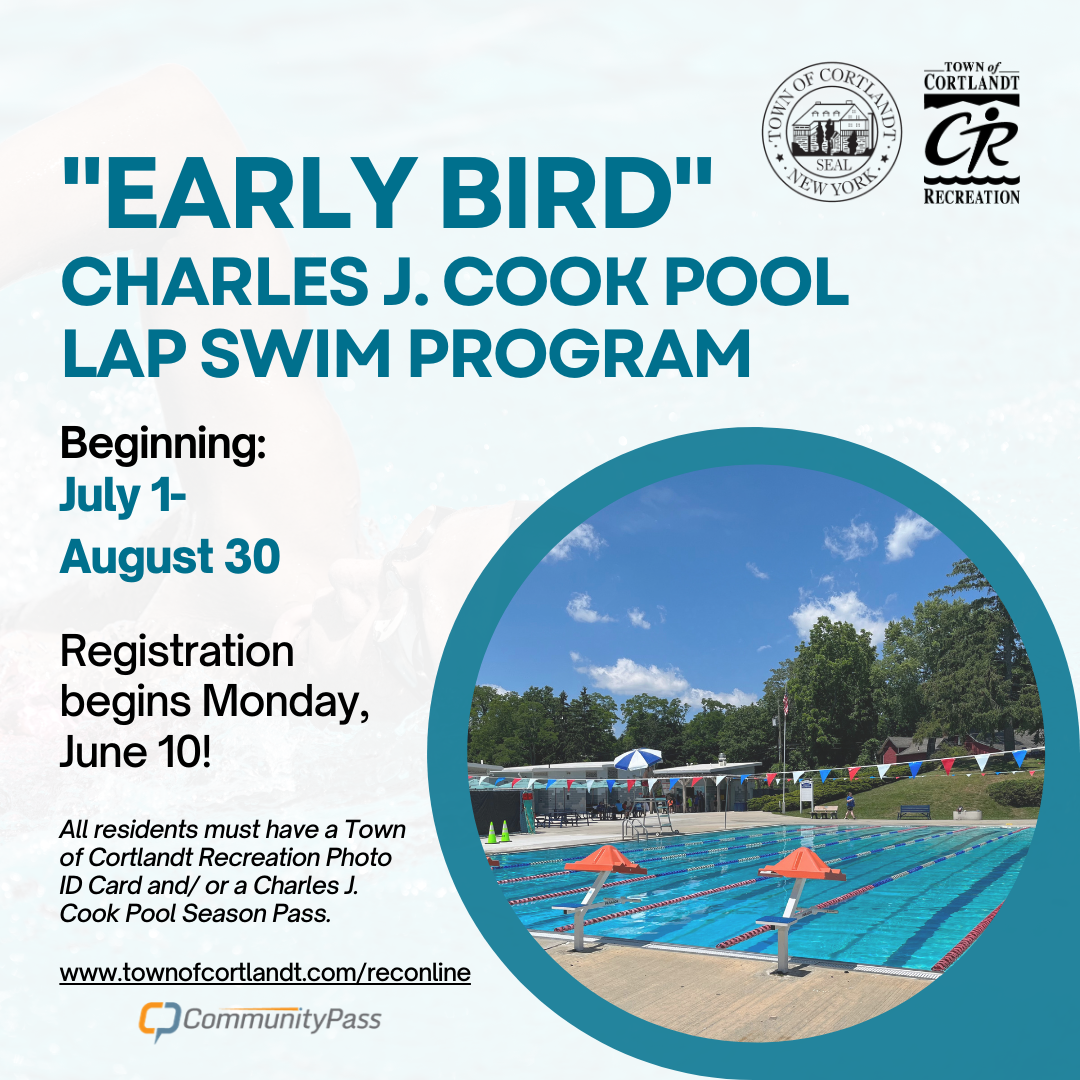 Registration for the 2024 "Early Bird" Lap Swim Program at Charles J. Cook Pool begins soon! This program provides fitness‐minded adults the chance to take to the water without interruption from other swimmers. The program will be broken into two separate time slots, 9:00 AM‐ 10:00 AM and 10:00‐ 11:00 AM. Within those sections, there will be two options, a single swimmer per lane option, and a two swimmers per lane option.