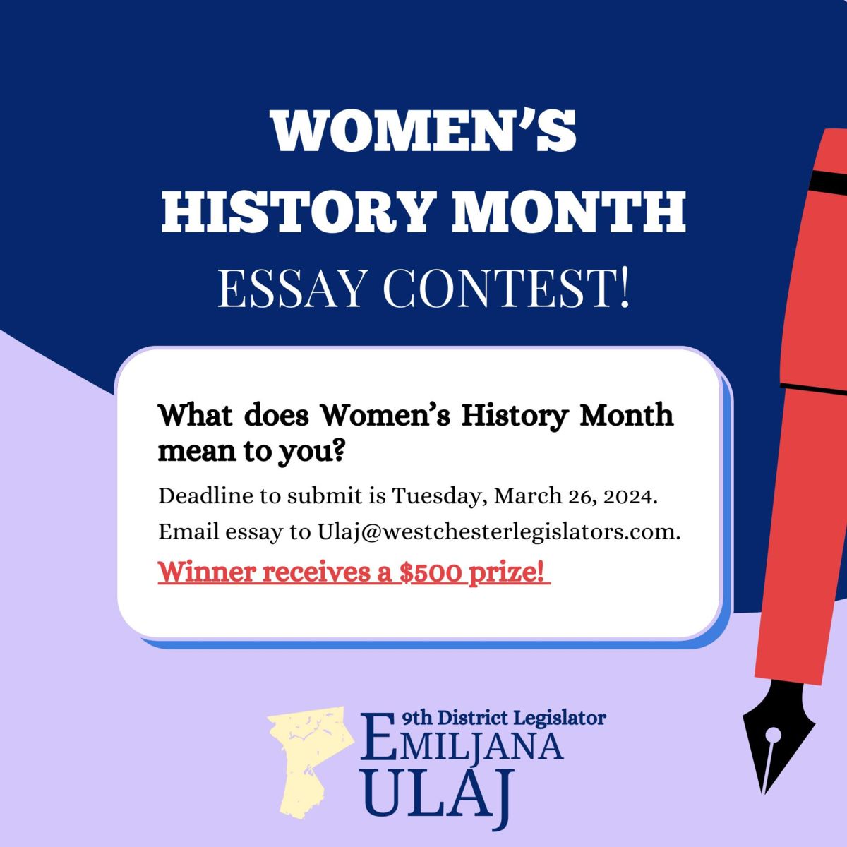 In commemoration of Women's History Month, Legislator Ulaj is holding an essay contest for high school students in District 9 with a $500 prize for the winner!