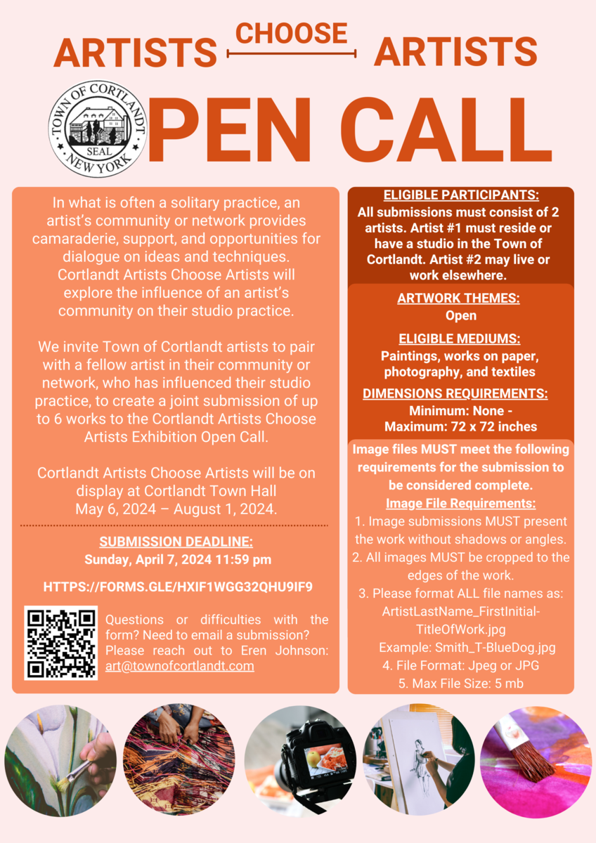 Cortlandt Artists are invited to pair with a fellow artist in their community or network, to jointly create submissions. All submissions must be the joint work of 2 artists. Artist #1 must reside or have a studio in the Town of Cortlandt. Artist #2 may live or work elsewhere. All genres are welcome. Eligible mediums include paintings, works on paper, photography and textiles. Selected works will be on view in the Vincent F. Nyberg General Meeting Room and hallways in Cortlandt Town Hall from May 6, 2024 – August 1, 2024. For more information about the Artists Choose Artists open call, please reach out to Eren Johnson, art curator, at art@townofcortlandt.com.