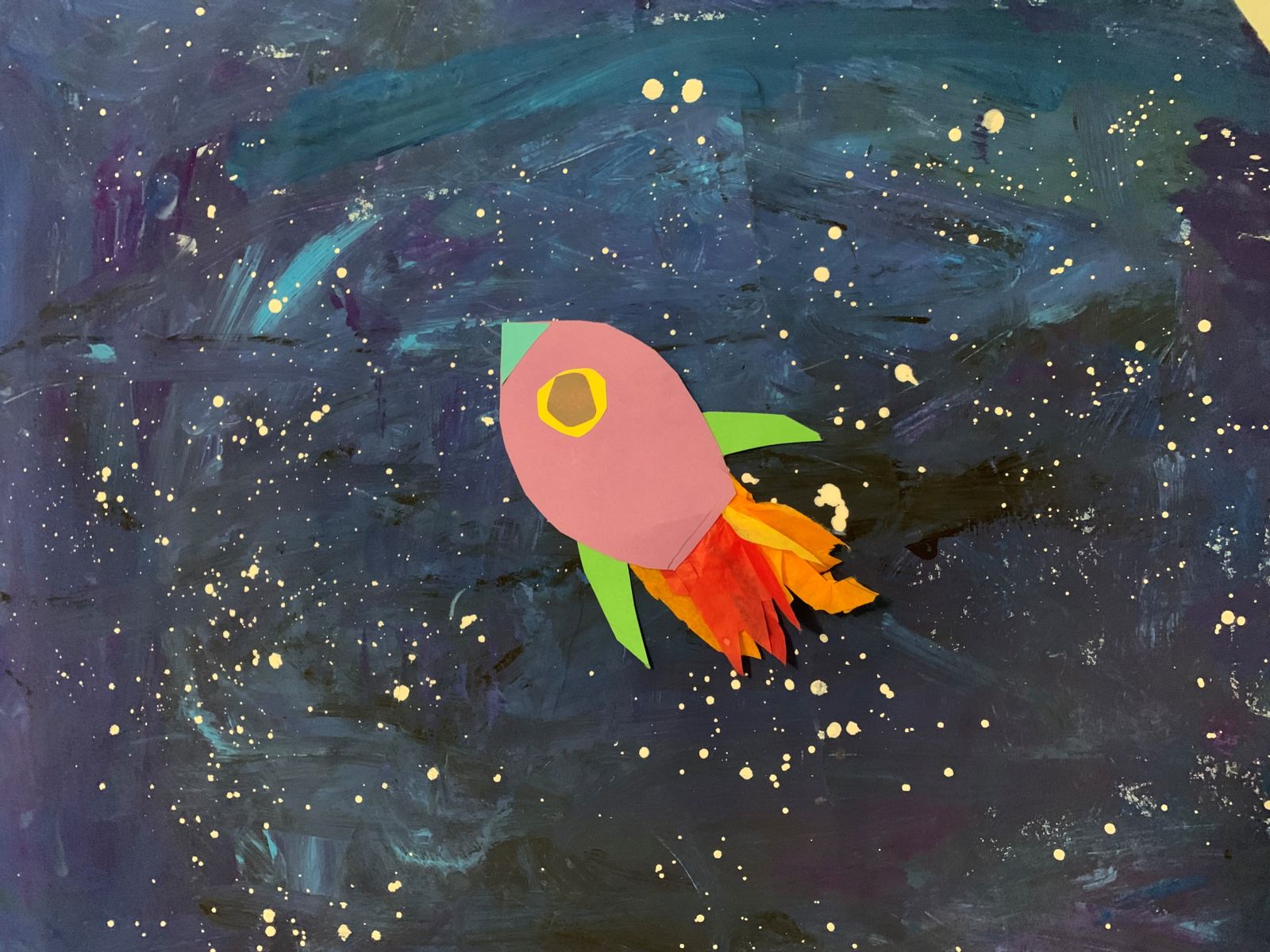 Now on view, the 2nd Annual Student Exhibition at Town Hall Exuberant Joy celebrates joy in all its forms. Mila Almonte submitted a timely work for this week’s eclipse. Inspired by her love of space Mila’s composition demonstrates a variety of techniques to record her dreams. From velvety brushwork on the ground and paint splattered stars to her collaged spaceship, Mila’s vision can inspire us all.