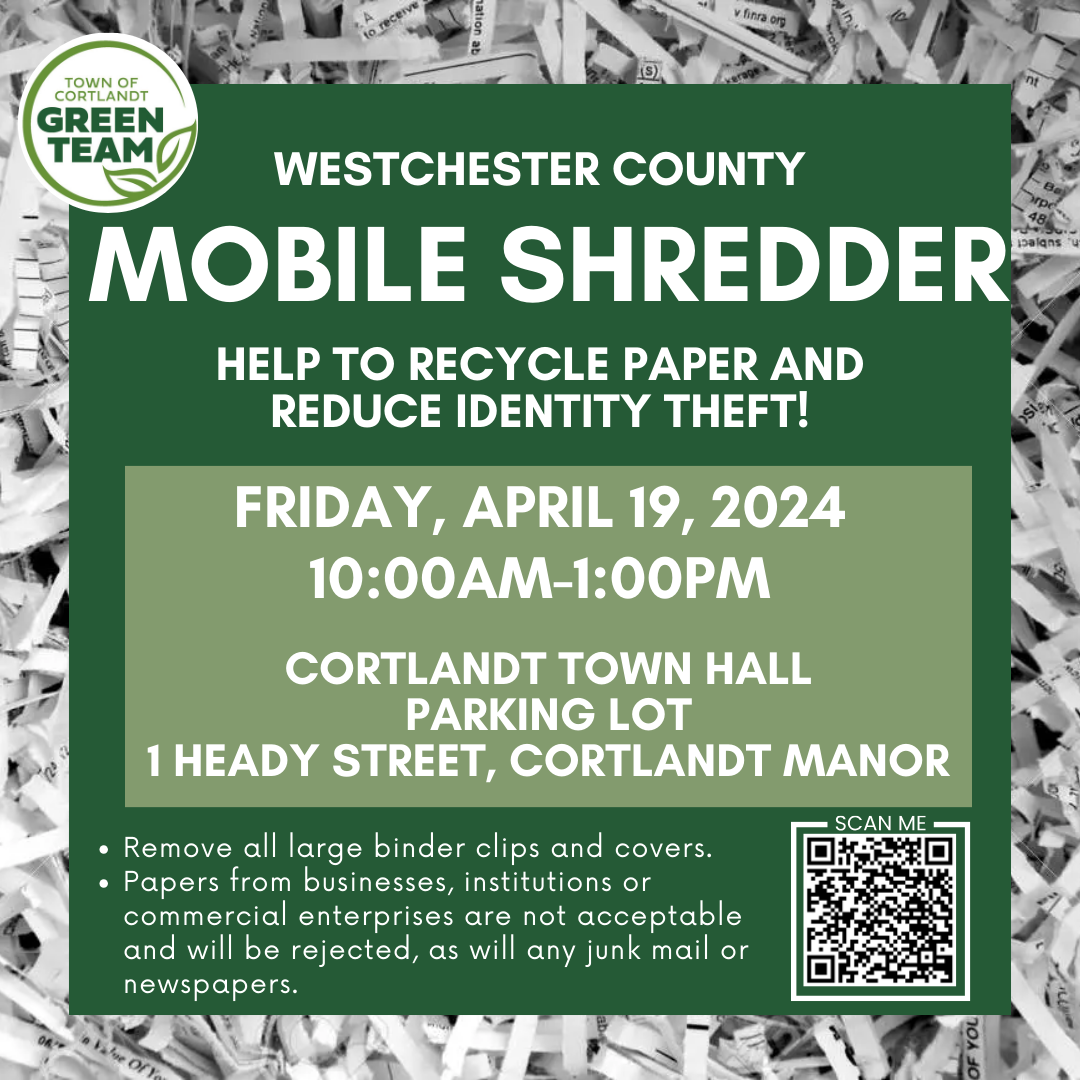 Who's ready to shred? The Mobile Shredder will be coming to Cortlandt Town Hall on Friday, April 19 from 10:00am-1:00pm! Residents can bring up to four file-sized (10”x12”x15”) boxes of confidential papers per household. Remove all large binder clips and covers. Papers from businesses, institutions or commercial enterprises are not acceptable and will be rejected, as will any junk mail or newspapers. https://events.westchestergov.com/eventsbycategory/44