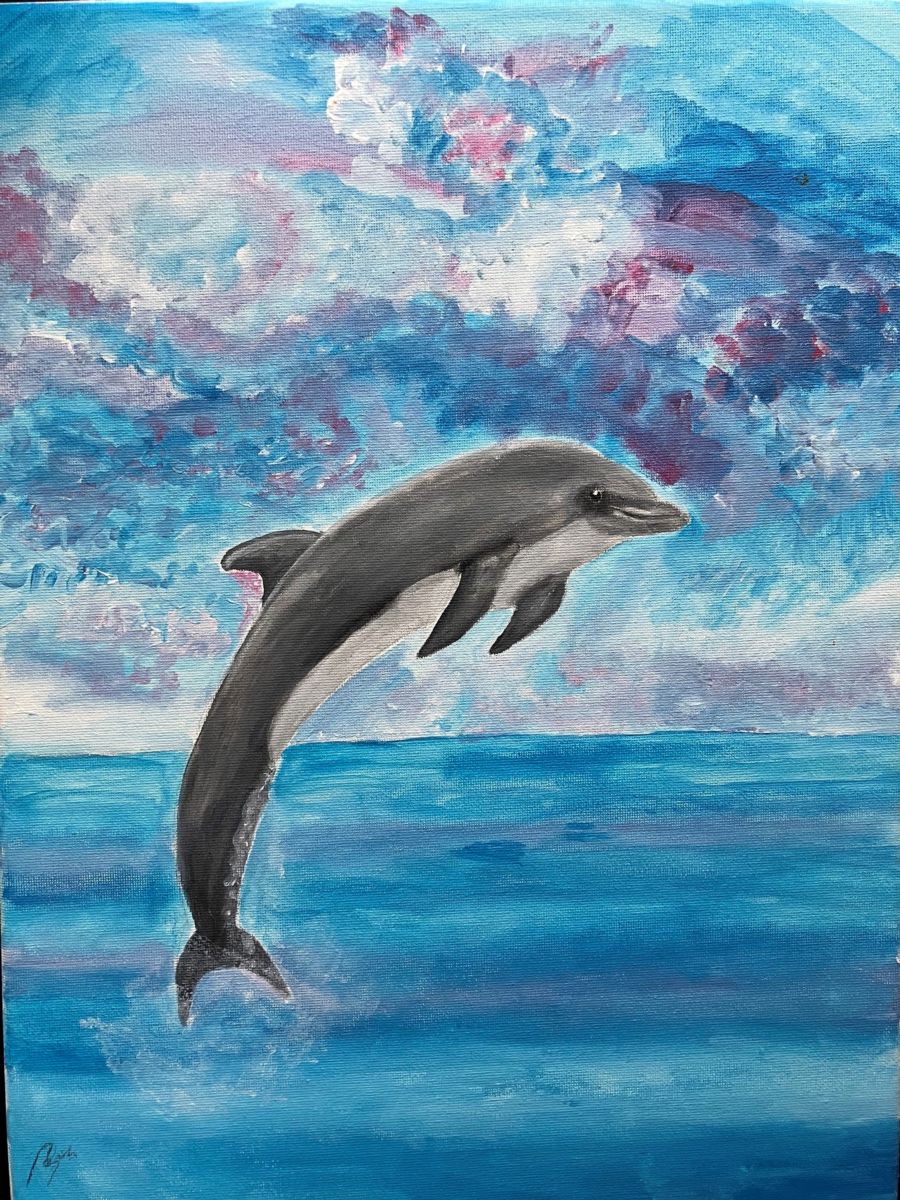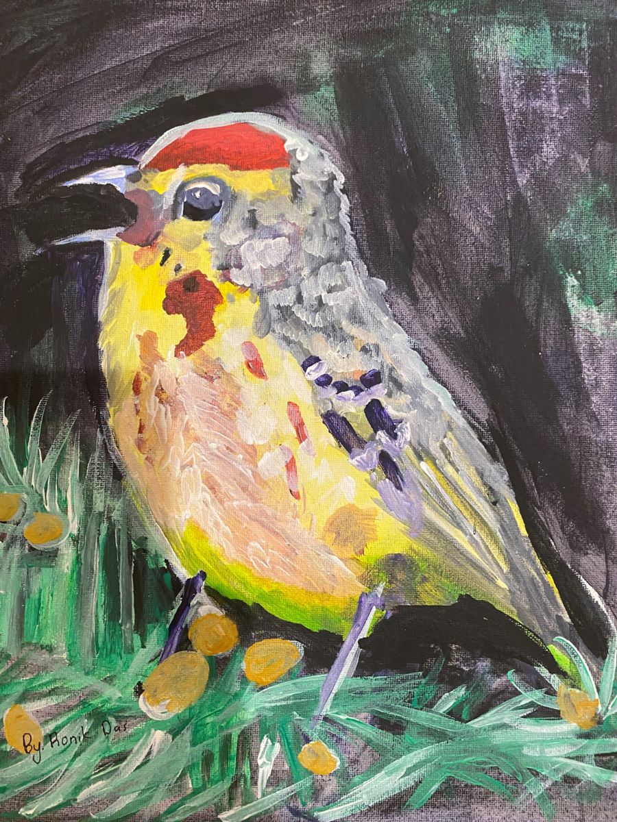 Now in its final weeks, the 2nd Annual Student Exhibition at Town Hall Exuberant Joy celebrates joy in all its forms. Whether through observations of their playful behaviors in the wild or catching a glimpse of their color after a dreary winter, our animal friends are a source of delight. For Ronik Das, like many of the other young artists in the exhibition, the natural world is centered prominently in his compositions. Ronik depicts a leaping dolphin and a cheerful sparrow in his compositions preserving moments of pleasure and joy for his audience.