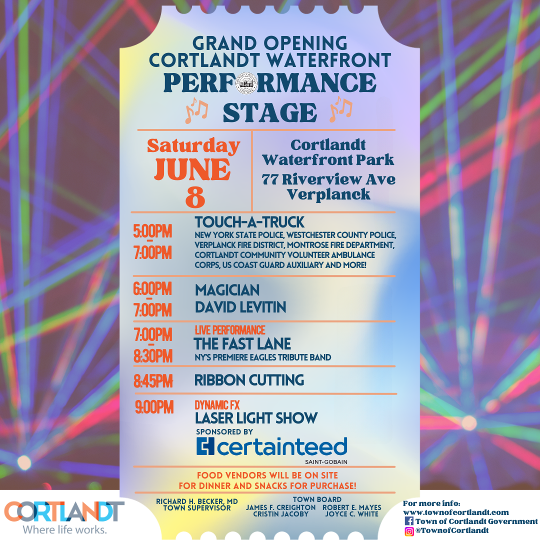 Join us on Saturday, June 8th to celebrate the grand opening of our newly constructed Cortlandt Waterfront Performance Stage! The Town of Cortlandt has planned an afternoon of activities for all members of the community. Enjoy a free community Touch-A-Truck event, a magic show by internationally acclaimed magician David Levitan, and live music performance by The Fast Lane! To end the night, we added on an epic Laser Light Show sponsored by Certainteed. Food trucks will be on site for dinner and snacks for purchase.