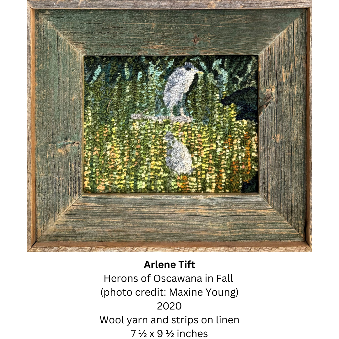 “I am a painterly rug hooker who loves to collaborate with photographers. I interpret their photos in a personal way with wool yarn and strips on a linen backing. To date I have hooked 22 pieces with permission from these talented people. Maxine and I are "Birds of a Feather." We connected because of our mutual love of nature and birds. Maxine kindly allowed me to hook her Heron at Oscawana in Fall because I loved it. Her photography is always inspiring, and this heron lived just down the road from me and very meaningful to both of us.” – Arlene Tift