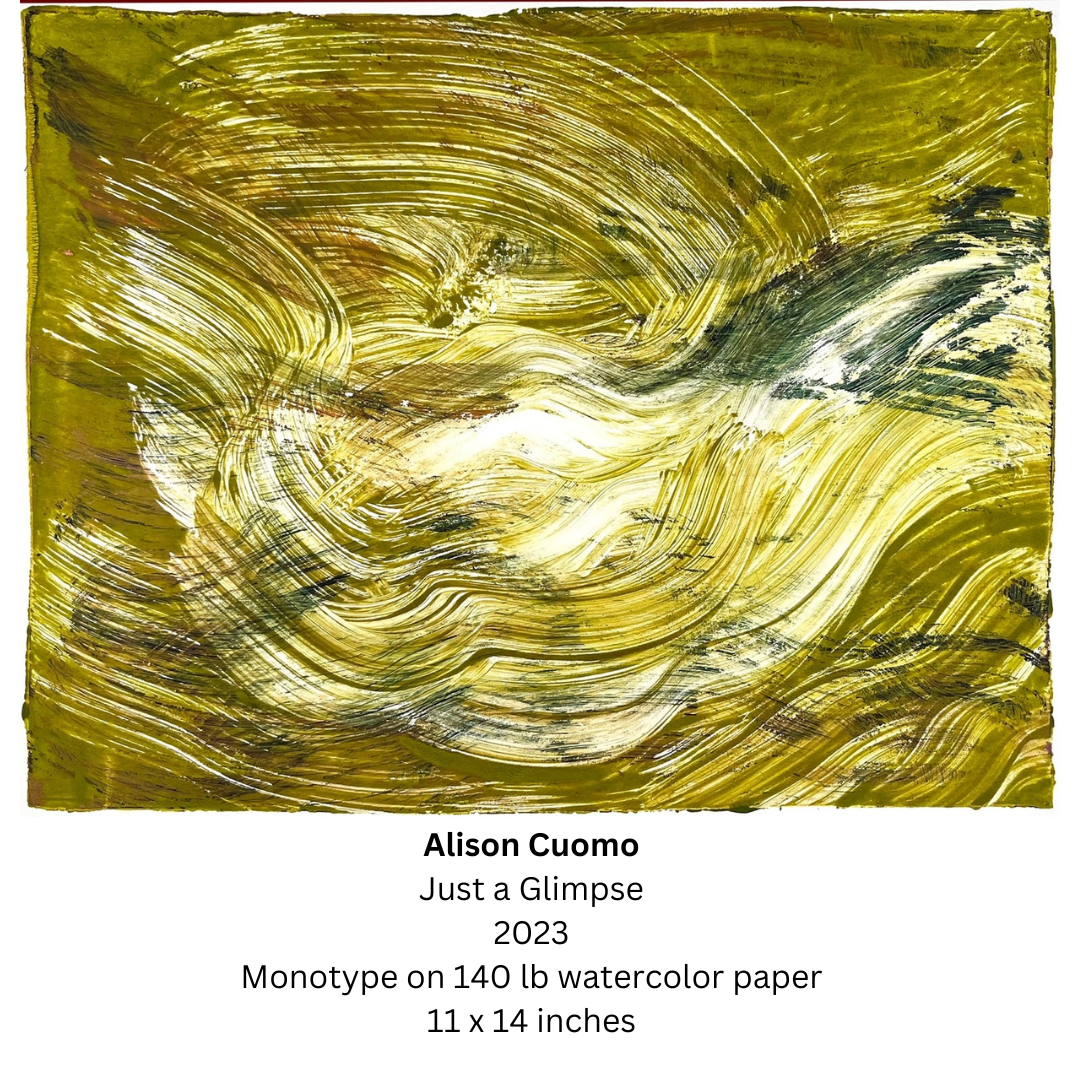 Now on view at Town Hall the exhibition Cortlandt Artists Choose Artists explores the influence of an artist’s network on their studio practice. With this pairing Cortlandt artist, John Cox, selected Alison Cuomo, a New York City artist, as his partner. Each artist uses different processes to achieve the same effect of light radiating from the work itself. John uses custom cut squeegees to pull varying layers of paint allowing light to emanate from the background of his canvas, while Alison works with a brush carefully layering pigment on a printing press plate to achieve an eruption of light in this Monotype print.