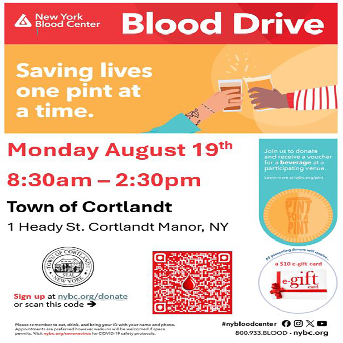 Give the gift of life and donate blood at the Cortlandt Town Hall Blood Drive on Monday, August 19. The New York Blood Center's busmobile will be stationed at Town Hall from 8:30am until 2:30pm. All presenting donors will receive a $10 e-gift card. Please remember to eat, drink and bring your ID with your name and photo. Appointments are preferred however walk-ins will be welcomed if space permits. To sign up, visit nybc.org/donate or you can call (800) 933-2566.
